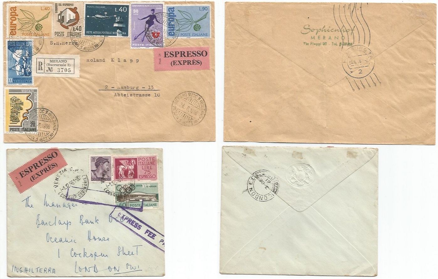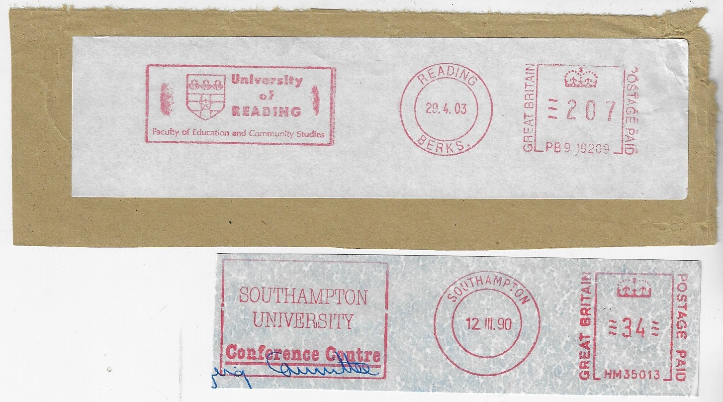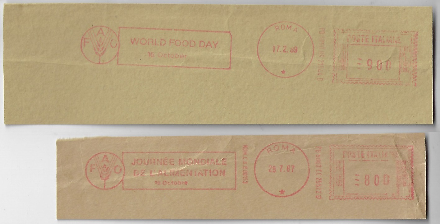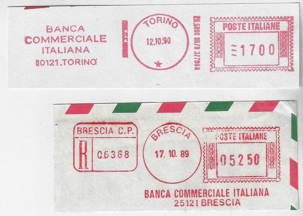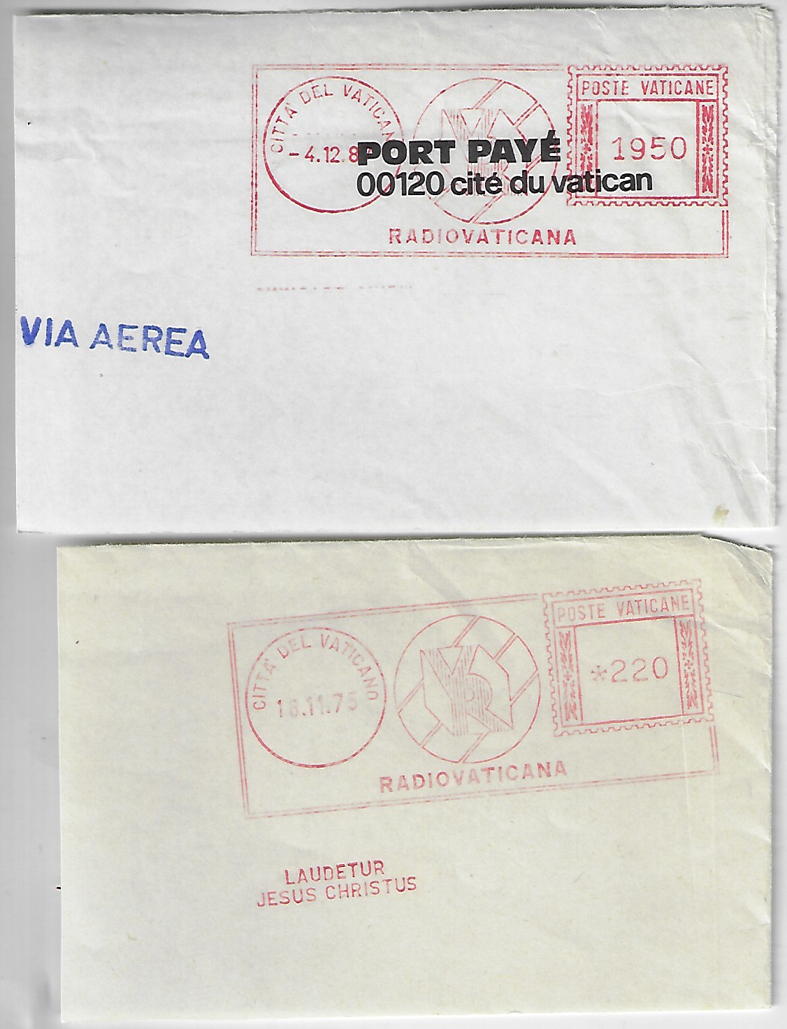 | 77598 | Vaticano, 1975/1987, 2 fragmentos de envelopes porteados com diferentes franquias mecânicas com slogan "Radiovaticana (Rádio Vaticano)", emissora de rádio da Santa Sé | 14,00 | Foto |