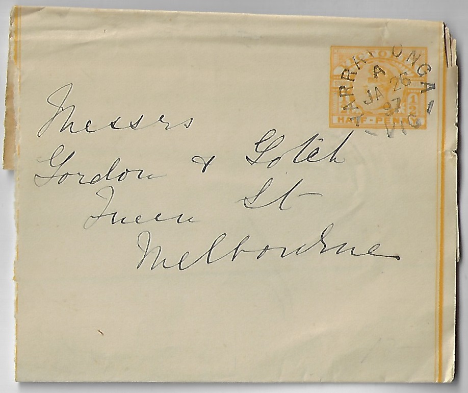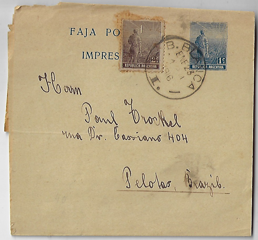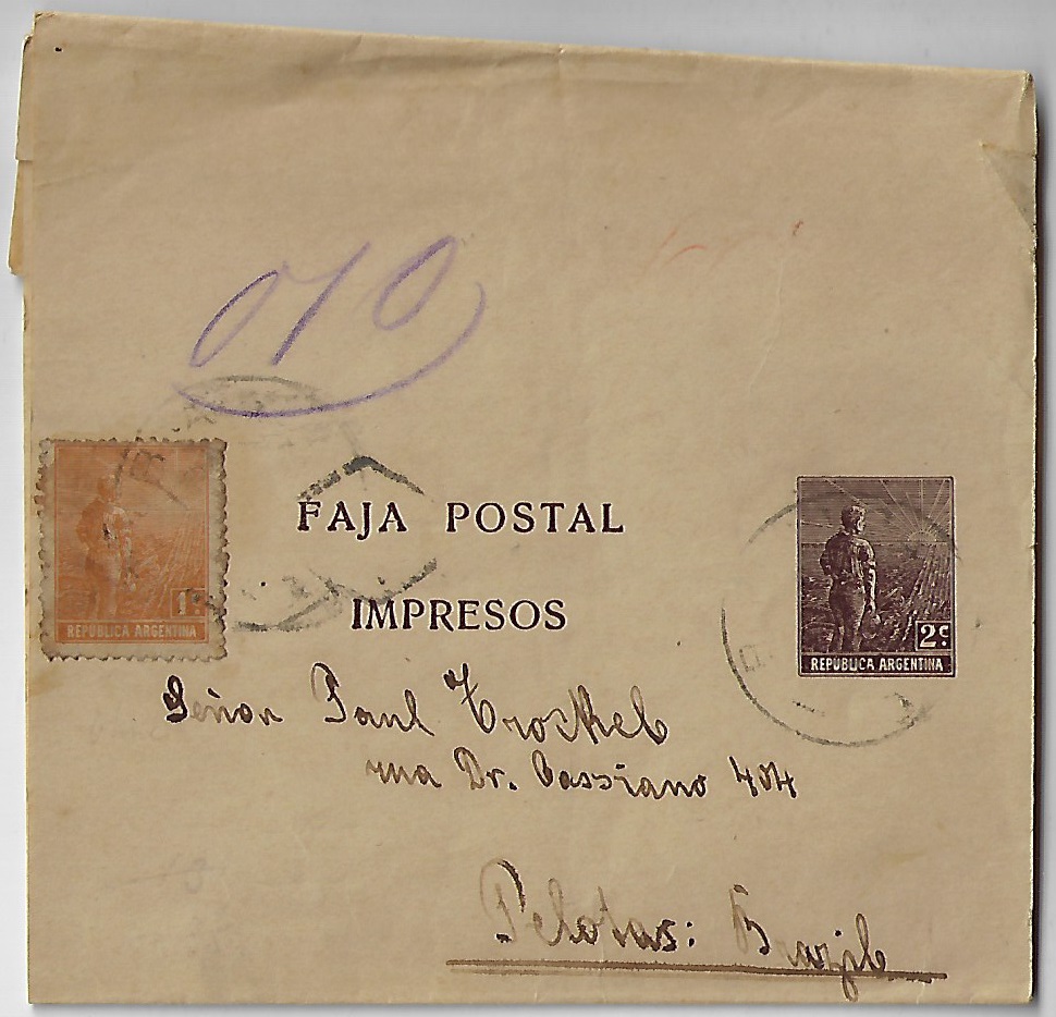 | 79420 | Argentina, 1916, inteiro postal tipo cinta para jornais com selo Trabalhador Agrícola 1 Centavo + selo adicional 2 Centavos, enviado de Bahia Blanca (23/1) para Pelotas / Brasil | 10,00 | Foto |