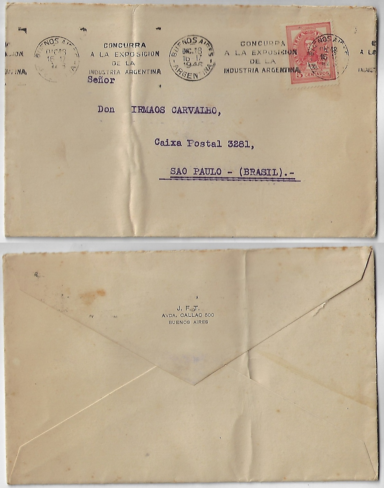| 74724 | Argentina, 1946, envelope comercial de J. F. T. enviado de Buenos Aires (19/12) para São Paulo, selo San Martin, carimbo com slogan "Participe da exposição da indústria argentina" | 10,00 | Foto |