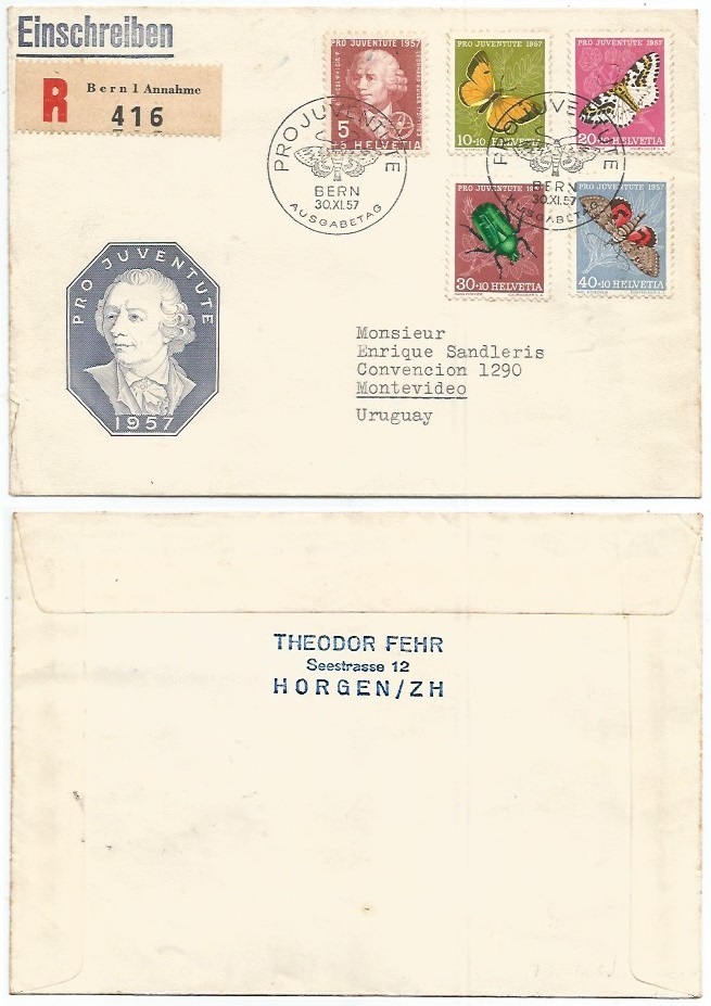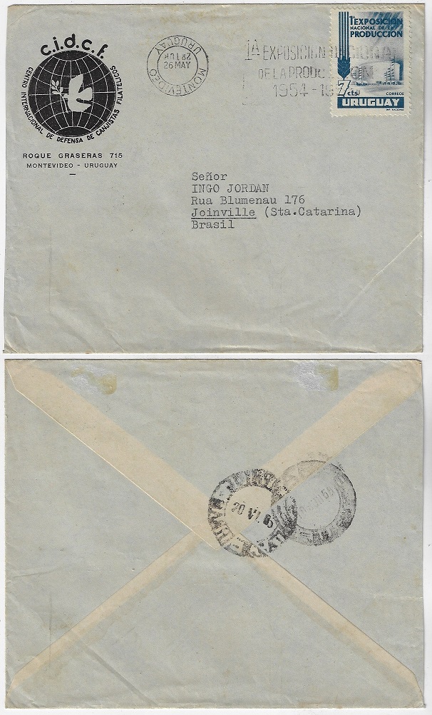 | 84327 | Uruguai, 1955, envelope de Montevidéu (26/5) para Joinville / SC (20/6), selo e flâmula alusivos a 1ª Exposição Nacional da Produção 1954-1955 | 20,00 | Foto |