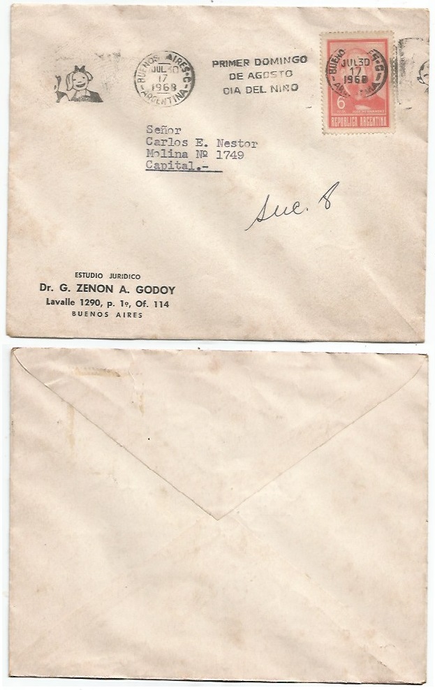 | 75737 | Argentina, 1968, envelope circulado com flâmula "Primeiro Domingo de Agosto Dia da Criança" | 10,00 | Foto |