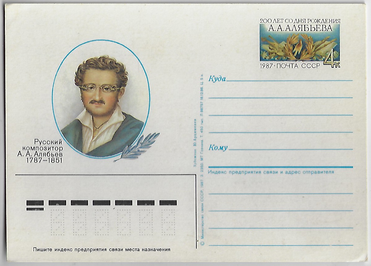 | 75866 | URSS, 1987, inteiro postal tipo bilhete alusivo ao compositor Alexander Aleksandrovich Alyabyev, sem uso, Óculos, Música | 10,00 | Foto |