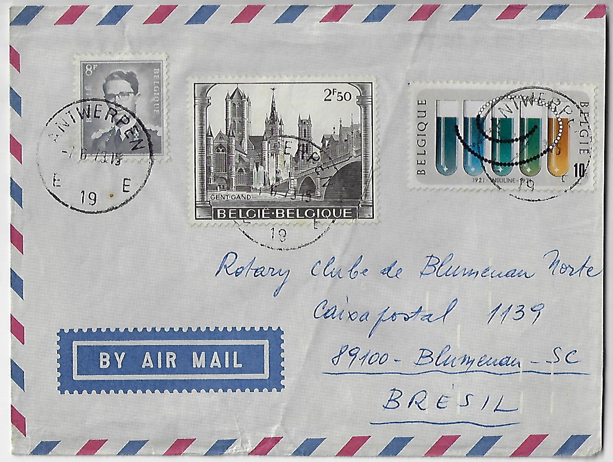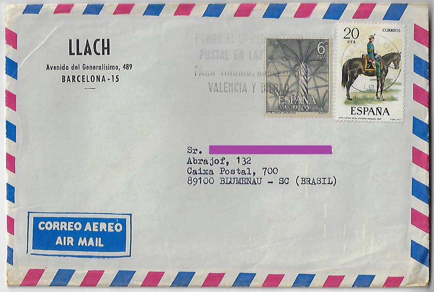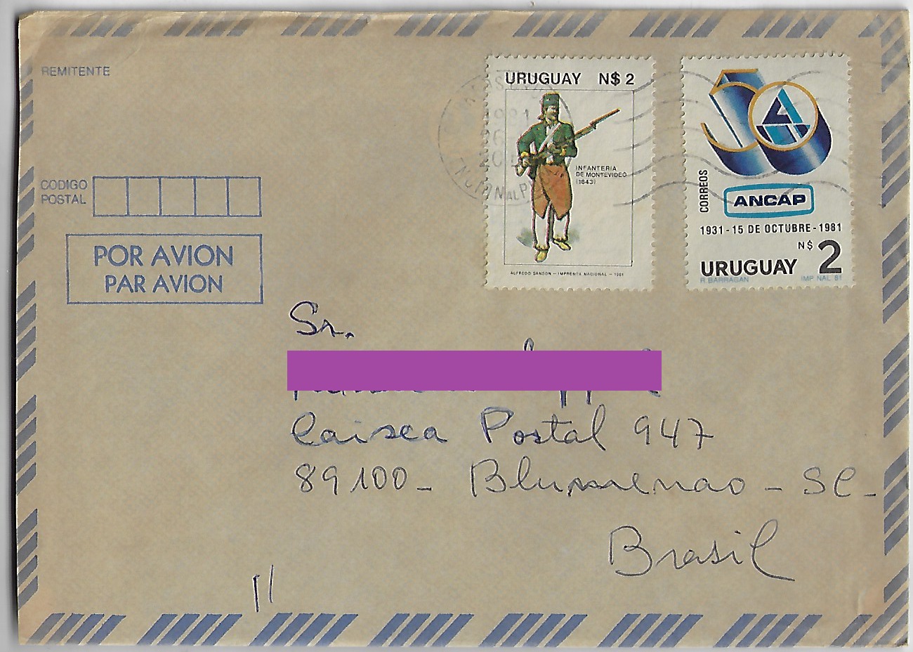 | 76079 | Uruguai, 1981, envelope aéreo de Montevidéu para Blumenau, porteado com selos Dia do Exército - Infantaria, 50 Anos da ANCAP - Administração Nacional de Combustíveis, Álcool e Portland | 10,00 | Foto |