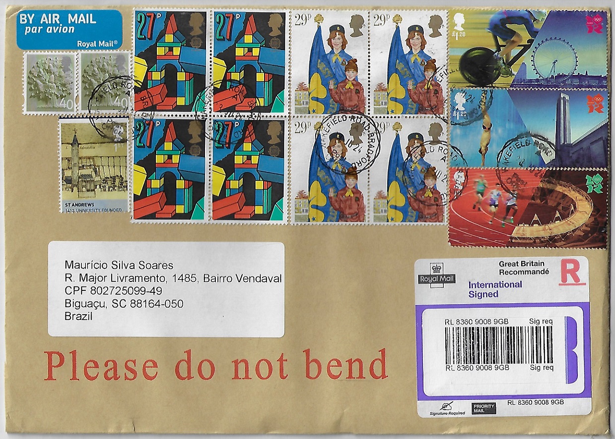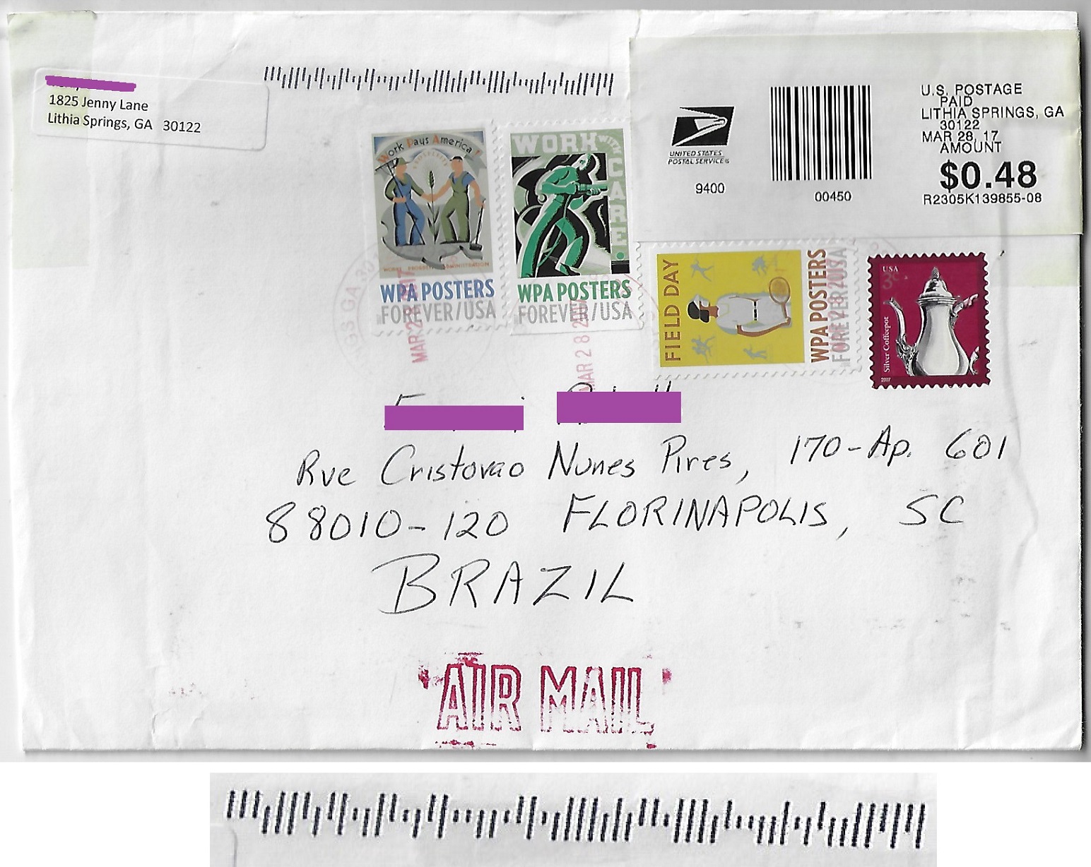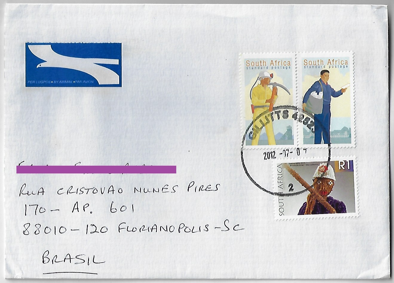 | 76963 | África do Sul, 2012, envelope aéreo enviado de Gillitts (7/7) para Florianópolis, porteado com selos Mineiro em Artesanato Beadwork e série Dia dos Trabalhadores - Profissões: Mineiro e Carteiro | 10,00 | Foto |