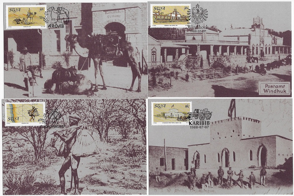 | 77259 | África do Sudoeste (atual Namíbia), 1988, série completa de 4 máximos postais, Centenário do Serviço Postal | 28,00 | Foto |