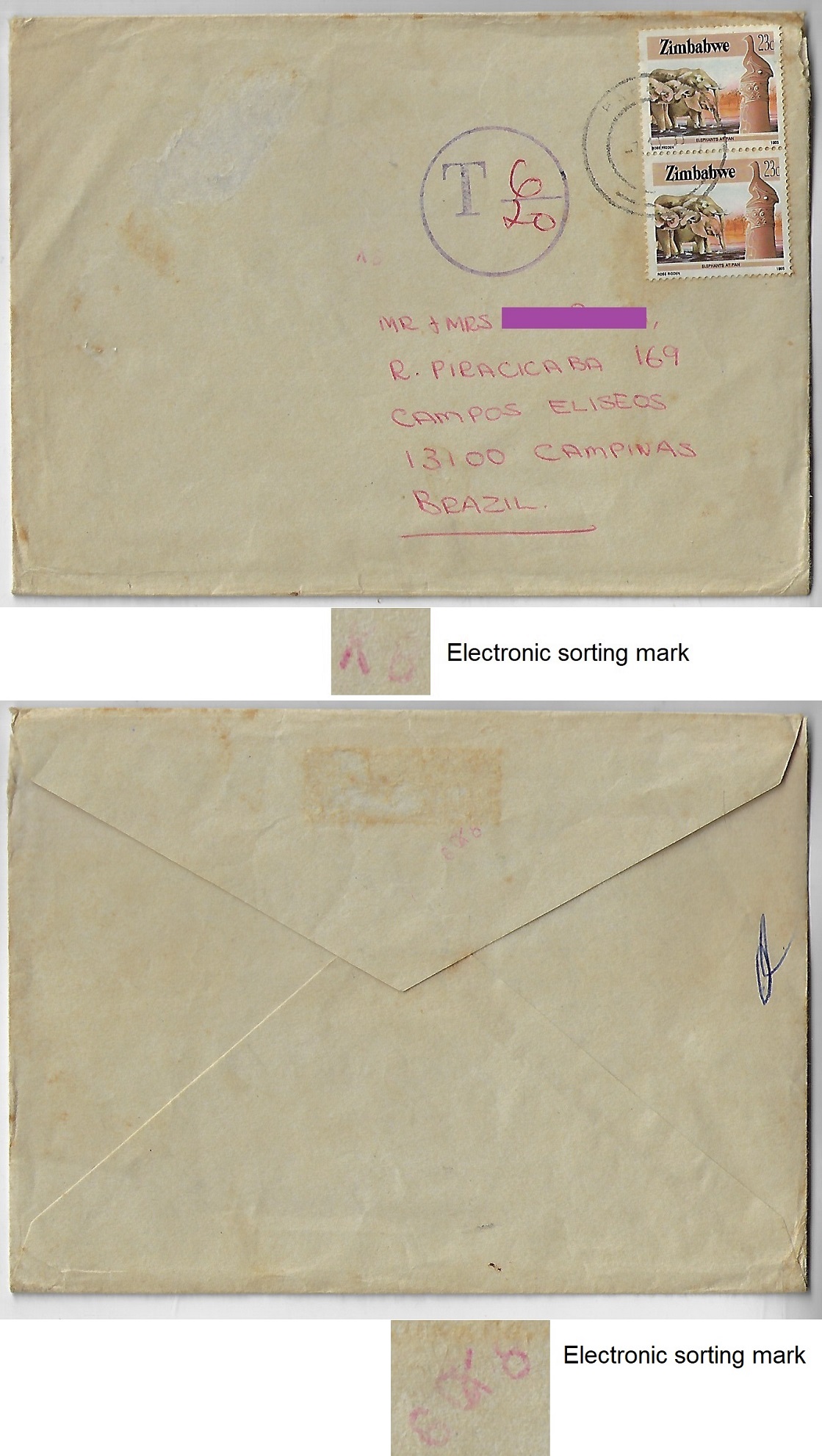 | 78120 | Zimbabwe, 1985, envelope enviado para Campinas, porteado com par de selos Elefantes tomando Água, carimbo de taxa devida, marcas de triagem eletrônica | 10,00 | Foto |