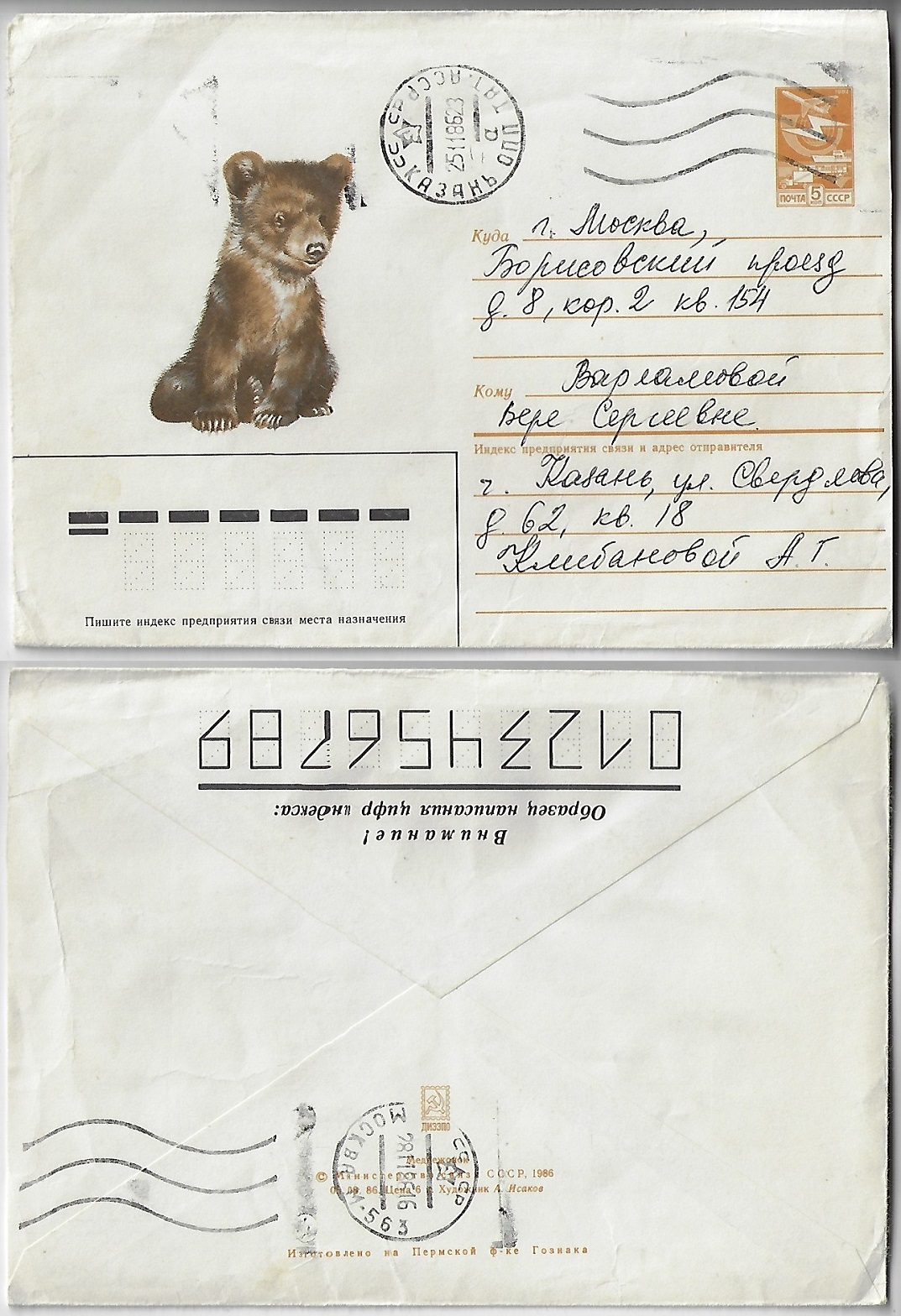 | 78329 | URSS, 1986, inteiro postal tipo envelope enviado de Kazan (25/11) para Moscou (28/11), gravura de filhote de Urso | 10,00 | Foto |