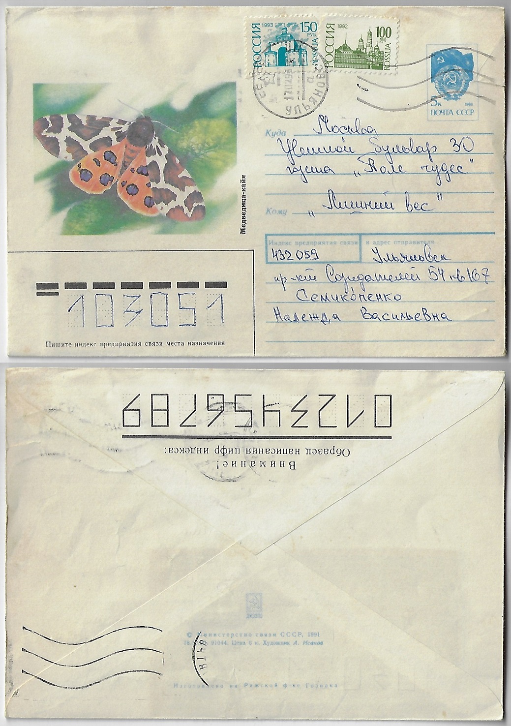 | 78451 | URSS, 1995, inteiro postal tipo envelope enviado de Ulianovsk (17/2) para Moscou, imagem da Mariposa Arctia caja, 2 selos adiconais | 10,00 | Foto |