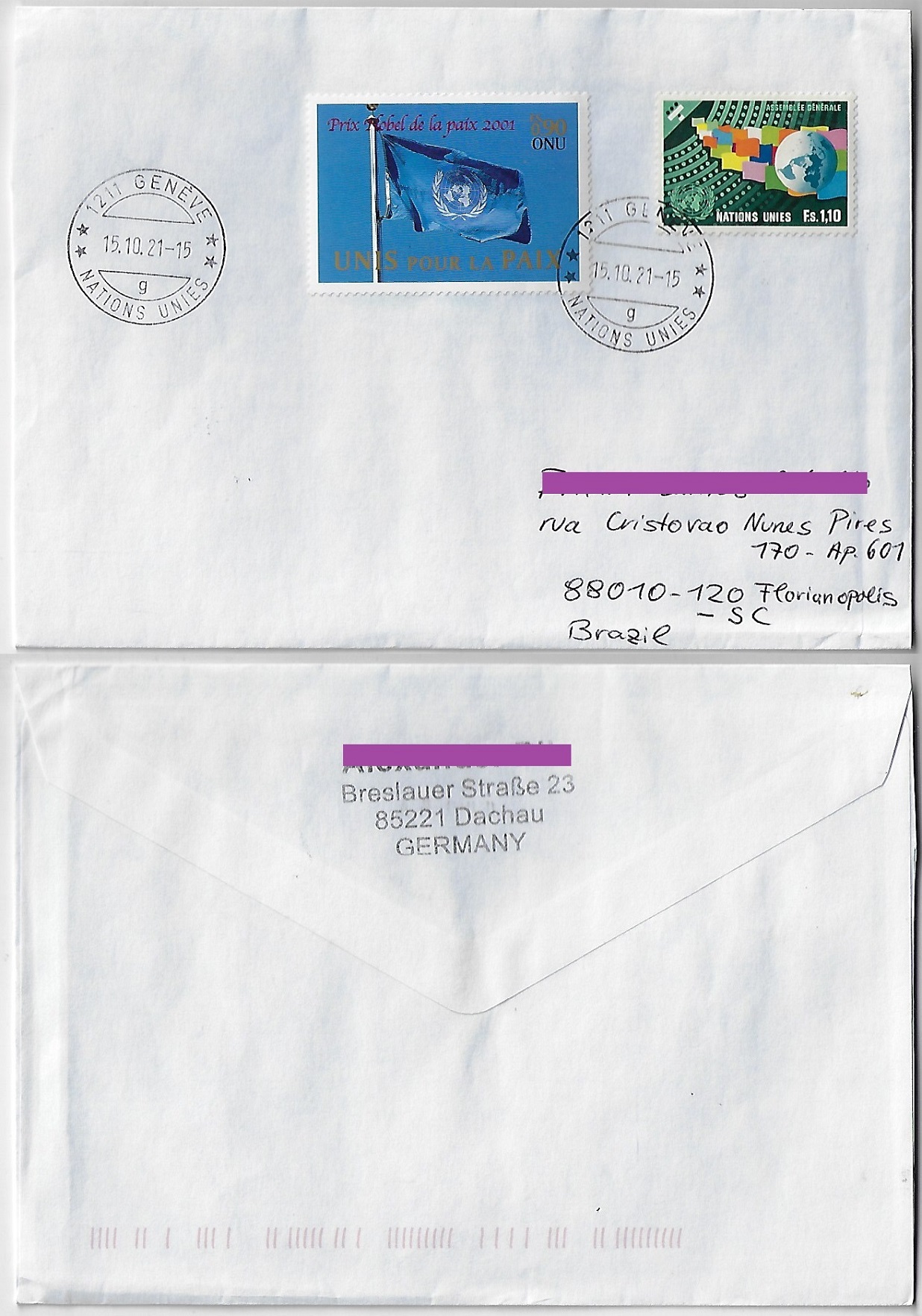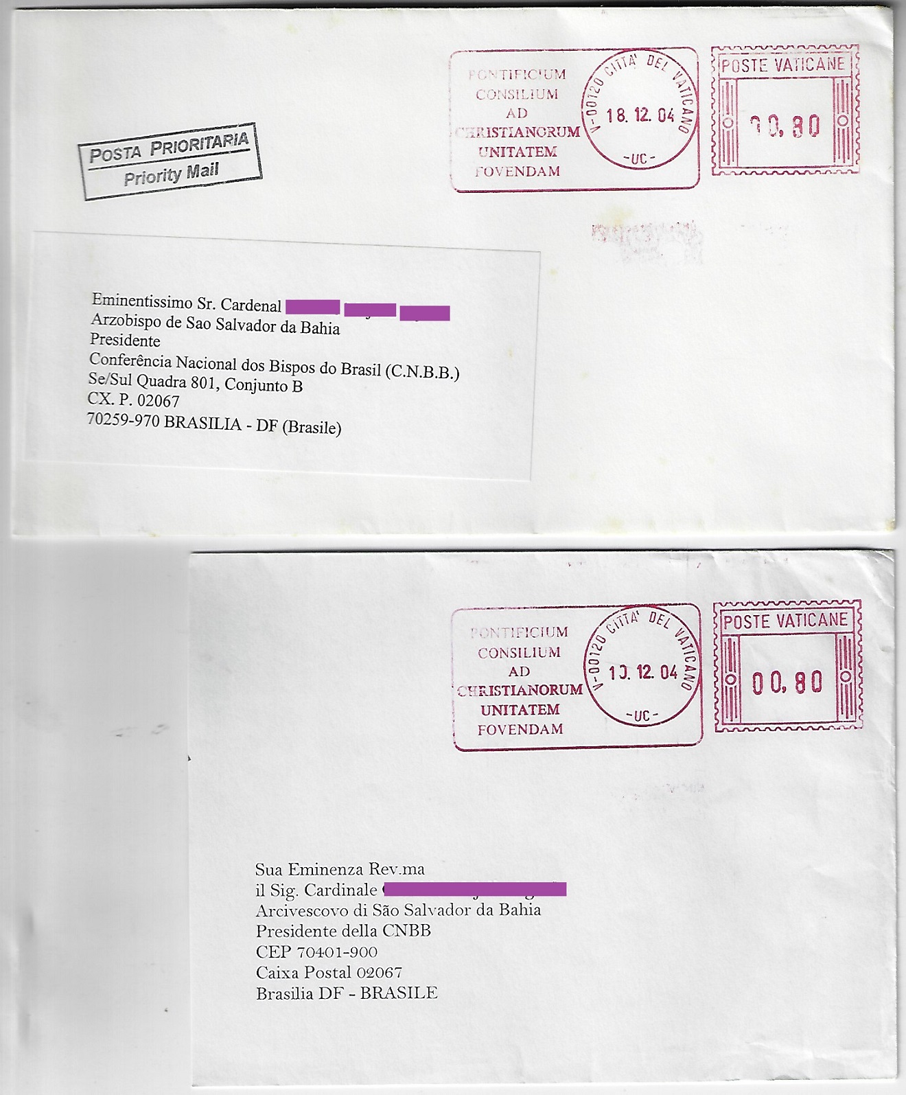 | 79081 | Vaticano, 2004, 2 envelopes enviados para Brasília, porteados com franquias mecânicas Audion com slogan "Pontifício Concílio para Promover a Unidade dos Cristãos" | 10,00 | Foto |