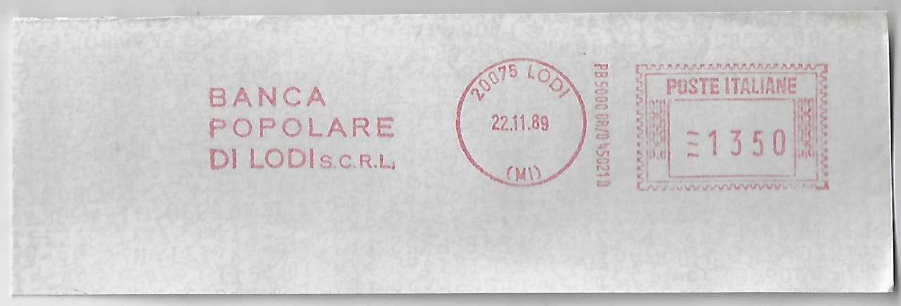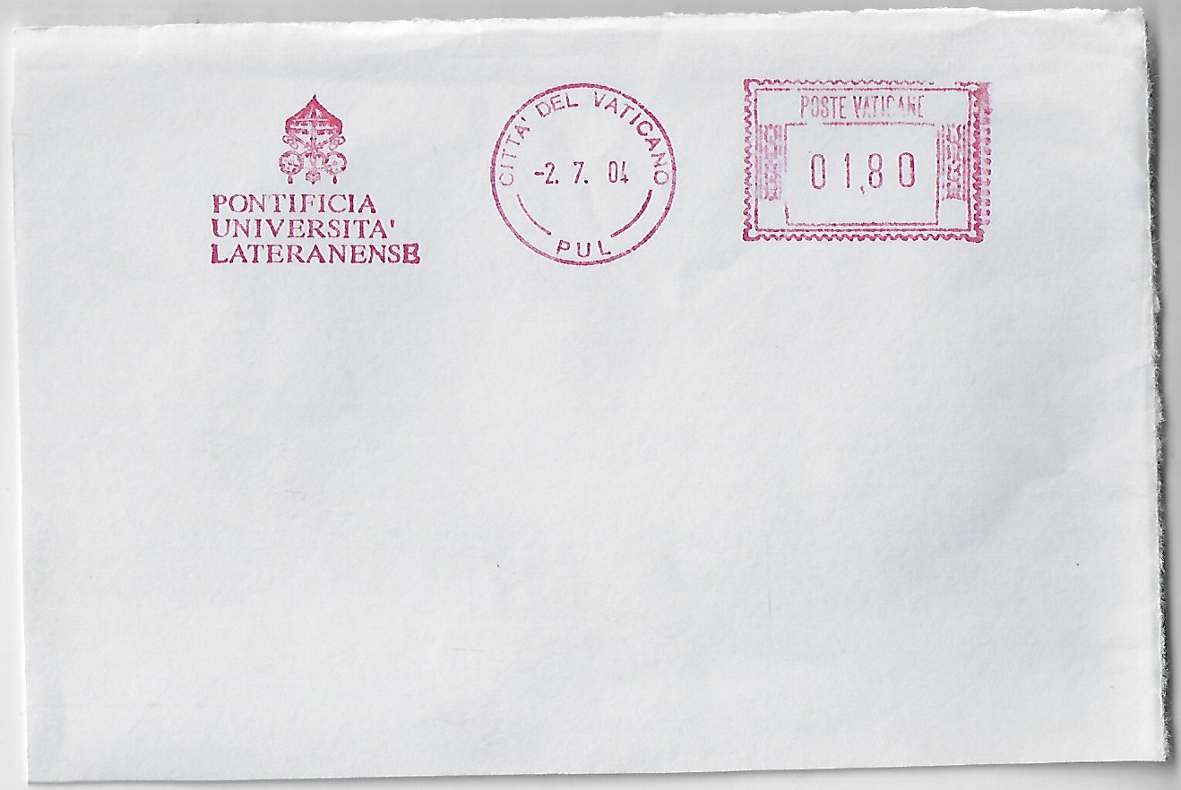 | 79094 | Vaticano, 2004, fragmento de envelope porteado com franquia mecânica Neopost “Electronic” com slogan "Pontificia Università Lateranense (Pontifícia Universidade Lateranense)" | 10,00 | Foto |