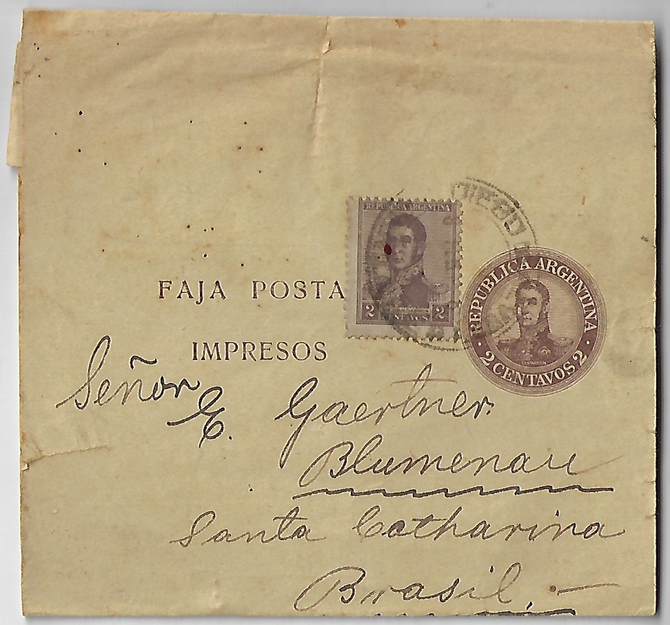 | 79421 | Argentina, 1918, inteiro postal tipo cinta para jornais com selo José de San Martín 2 Centavos + selo adicional 2 Centavos, enviado para Blumenau / Brasil | 10,00 | Foto |
