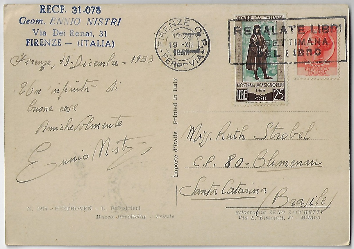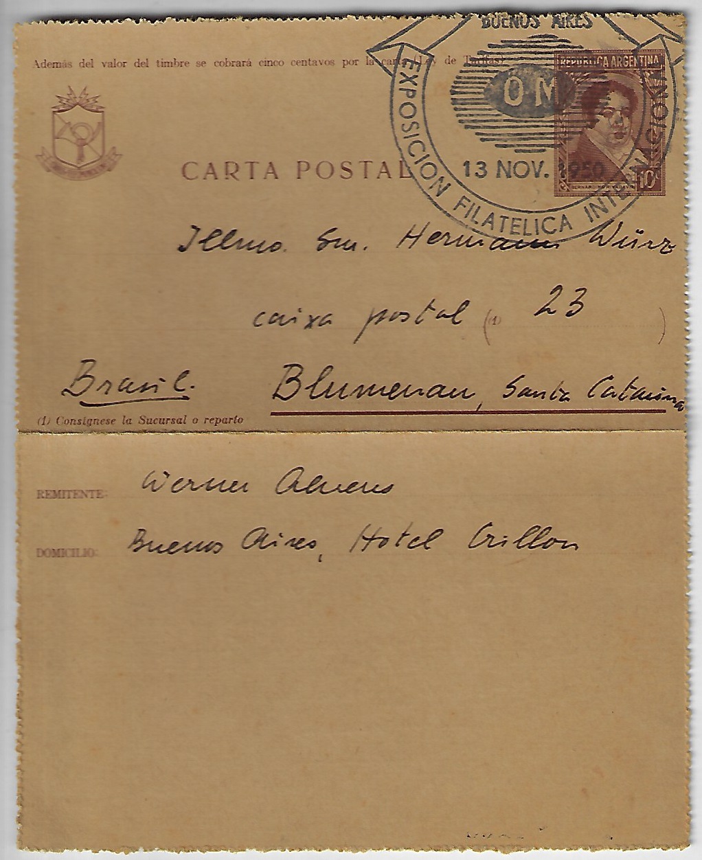 | 79975 | Argentina, 1950, inteiro postal tipo carta bilhete selo 10 Centavos enviado de Buenos Aires (13/11) para Blumenau | 10,00 | Foto |