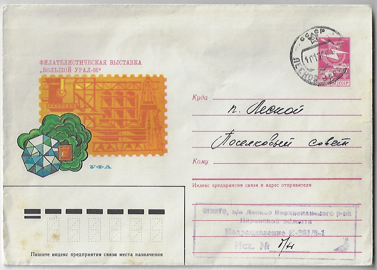| 79857 | URSS, 1986, inteiro postal tipo envelope alusivo a Exposição de Filatelia, Grande Ural, Mineralogia, Geologia | 10,00 | Foto |