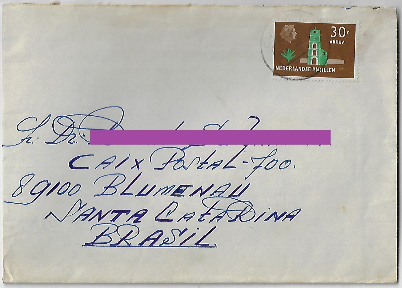 | 79939 | Antilhas Holandesas, 1970s, envelope enviado de Curaçao para Blumenau, selo 30 Cents, Forte Willem III, em Aruba | 10,00 | Foto |