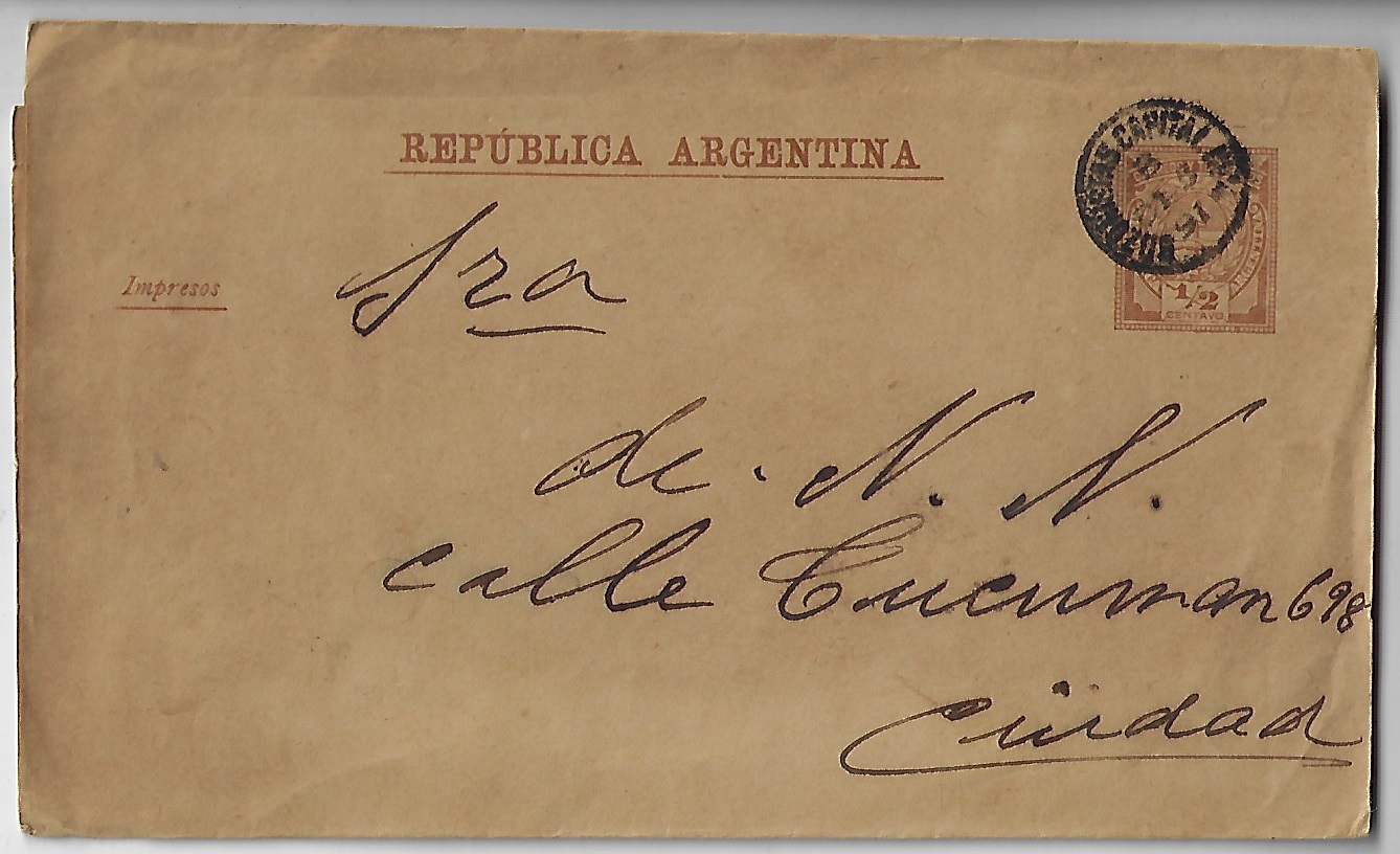 | 79968 | Argentina, 1891, inteiro postal tipo cinta para jornais selo ½ Centavo circulado em Buenos Aires | 10,00 | Foto |