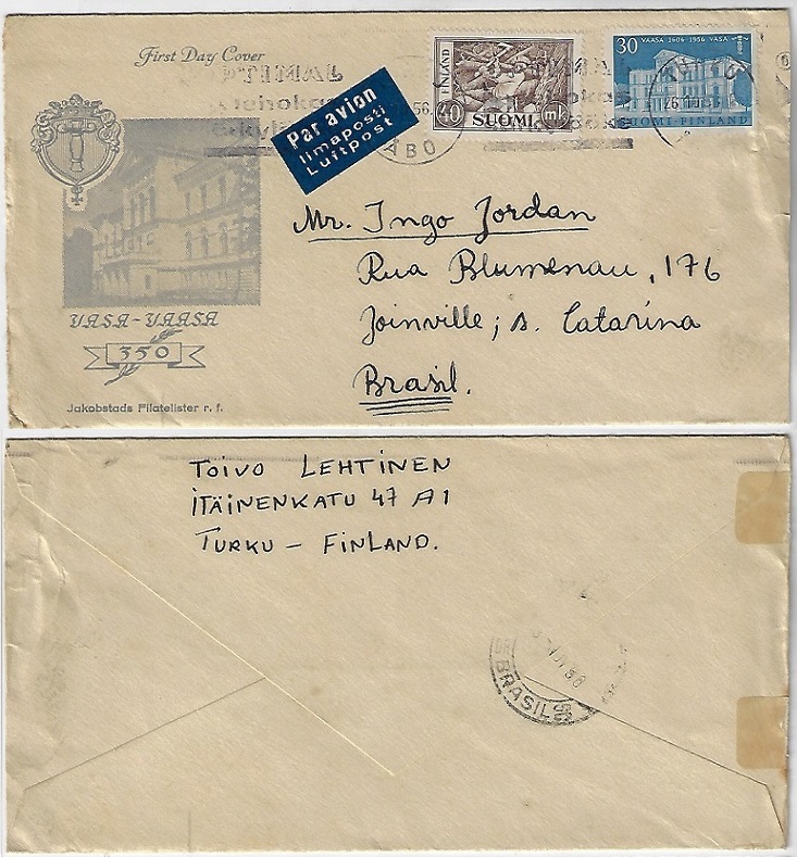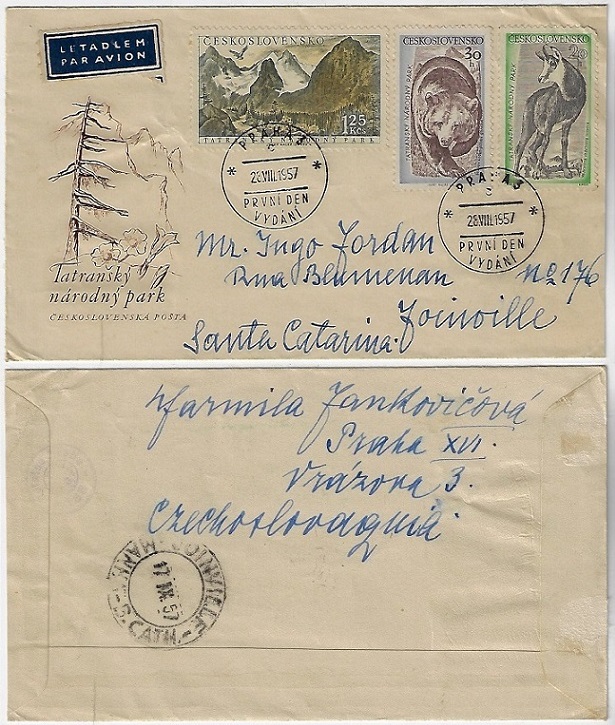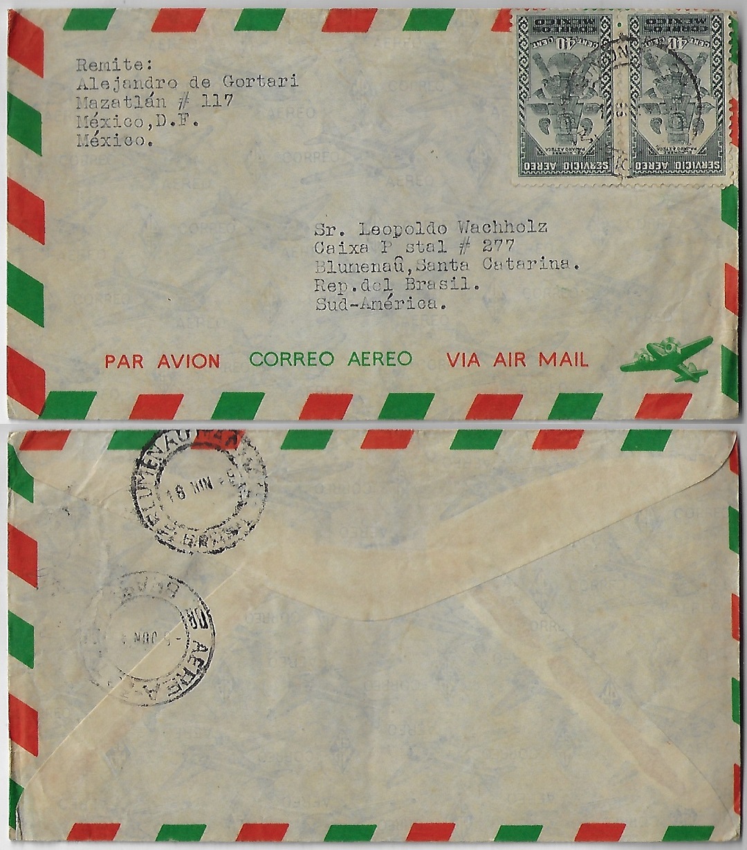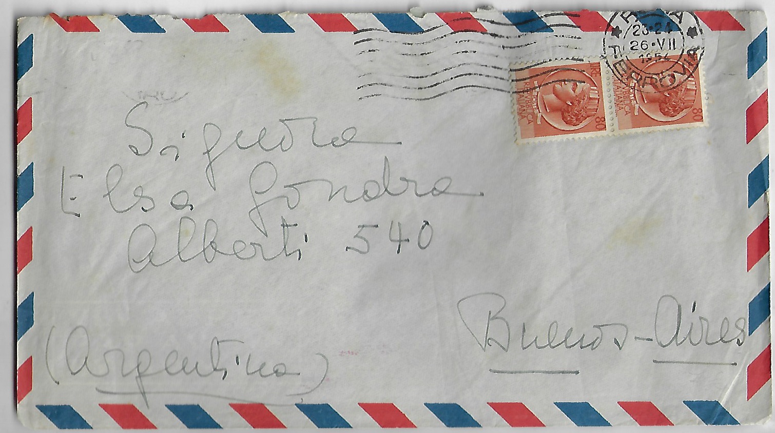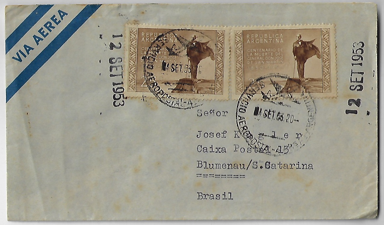 | 80065 | Argentina, 1953, envelope aéreo de Buenos Aires (4/9) para Blumenau (11/9), 2 selos Centenário da Morte do General José de San Martin | 10,00 | Foto |