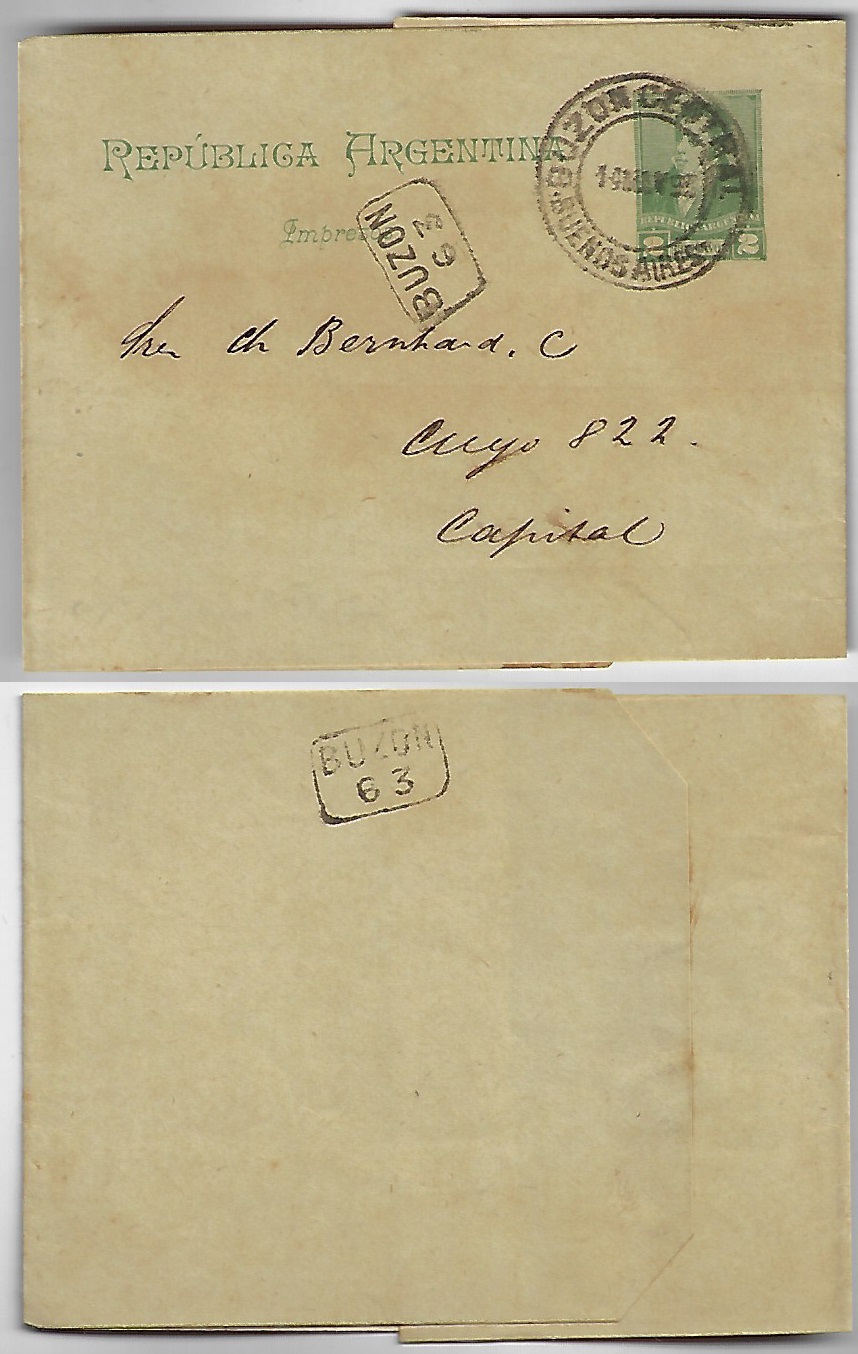 | 80179 | Argentina, 1890s, inteiro postal tipo cinta para jornais selo 2 Centavos, circulado em Buenos Aires, carimbo da agência "Buzon Central" e carimbos "Buzon 63" | 10,00 | Foto |