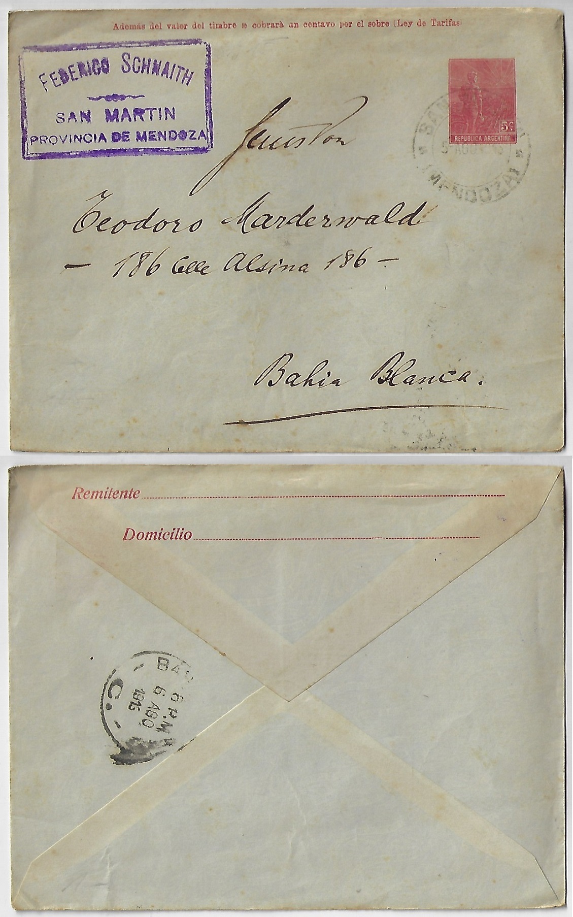 | 80321 | Argentina, 1915, inteiro postal tipo envelope selo impresso 5 Cents Trabalhador Agrícola enviado de Mendoza (5/8) para Bahia Blanca (6/8) | 10,00 | Foto |