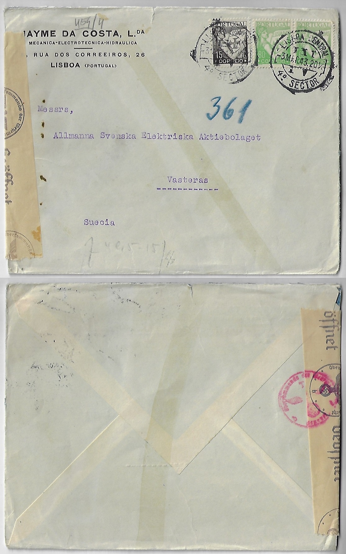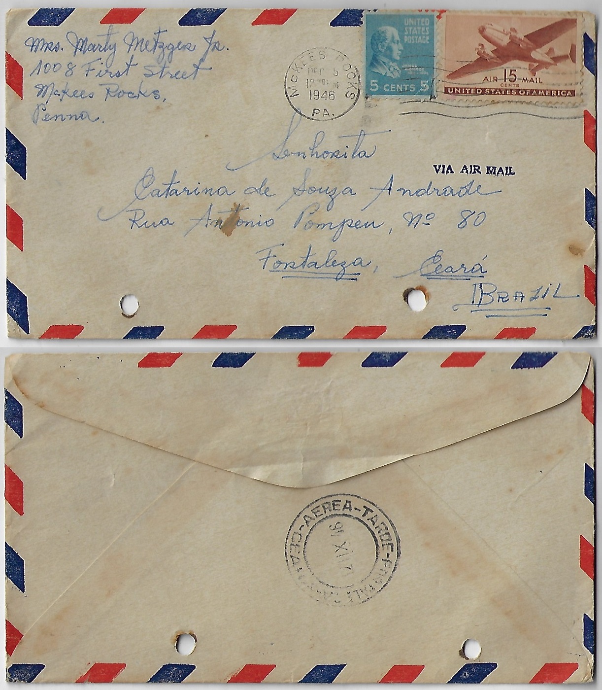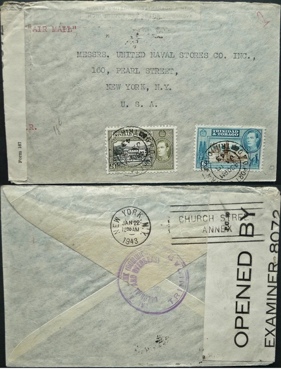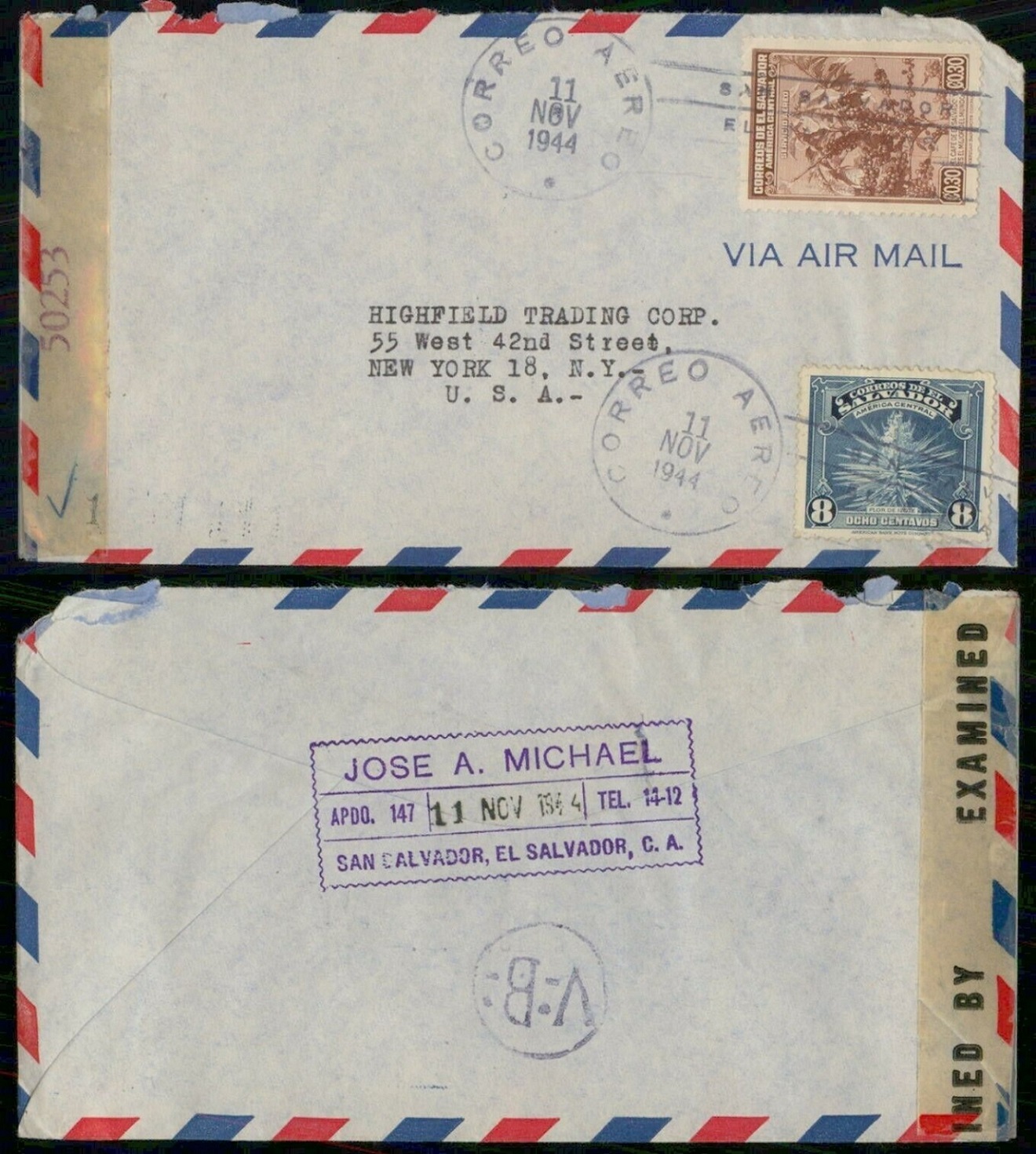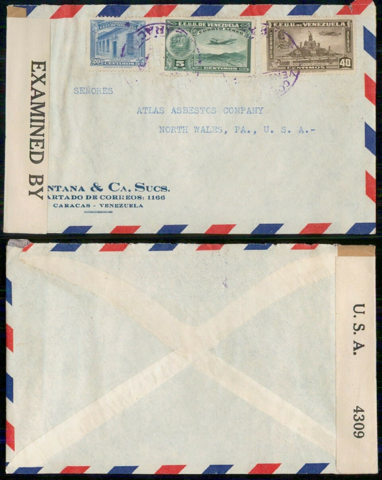 | 83152 | Venezuela, 1940s, envelope comercial de Santana & Ca. Sucs. enviado por correio aéreo de Caracas para North Wales / EUA, porteado com 3 selos, etiqueta de censura americana | 20,00 | Foto |