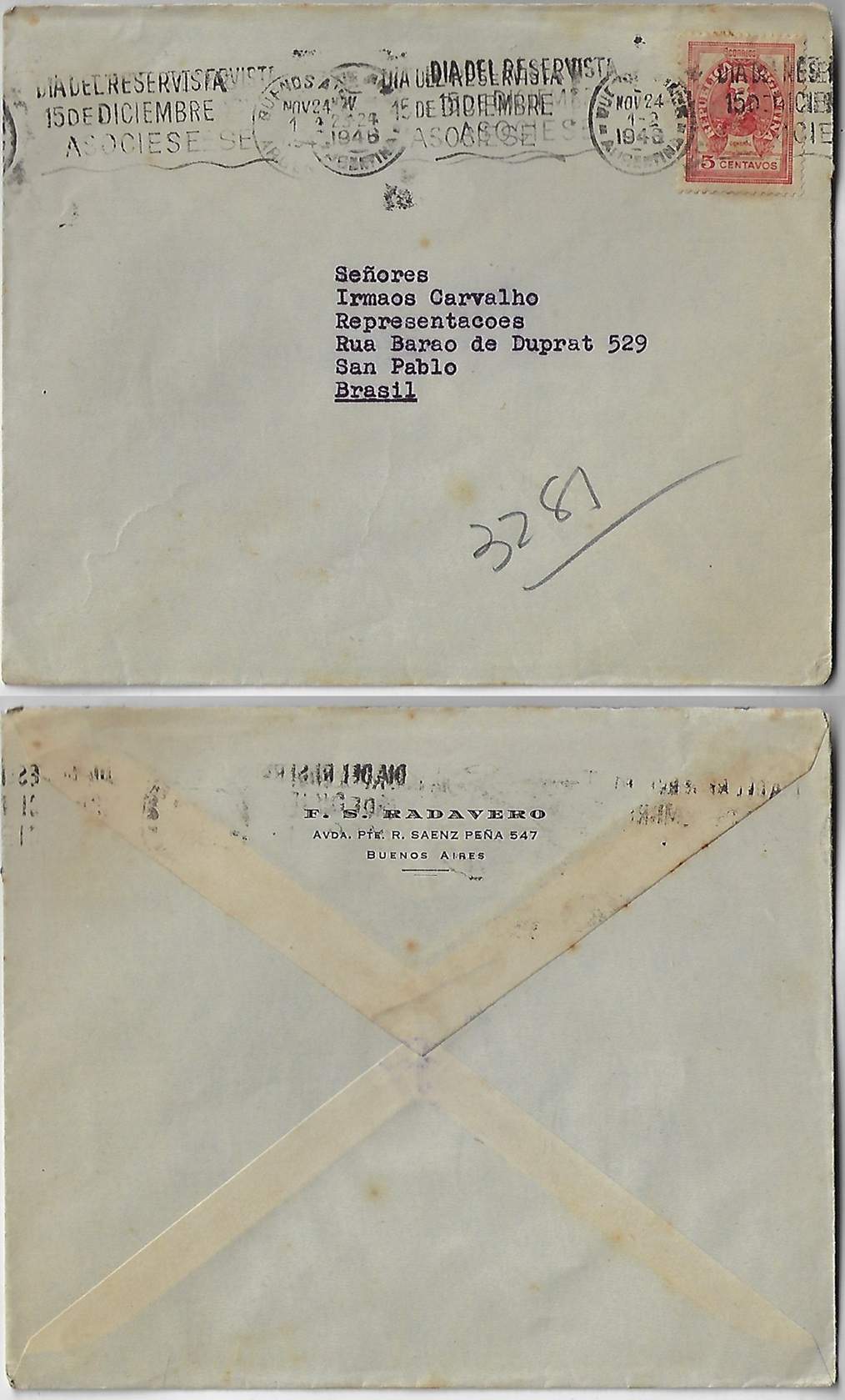 | 80437 | Argentina, 1946, envelope comercial de F. S. Radavero enviado de Buenos Aires (24/11) para São Paulo, reencaminhado para Caixa Postal, selo San Martin, carimbo com slogan "Dia do Reservista - 15 de Dezembro - Associe-se" | 10,00 | Foto |