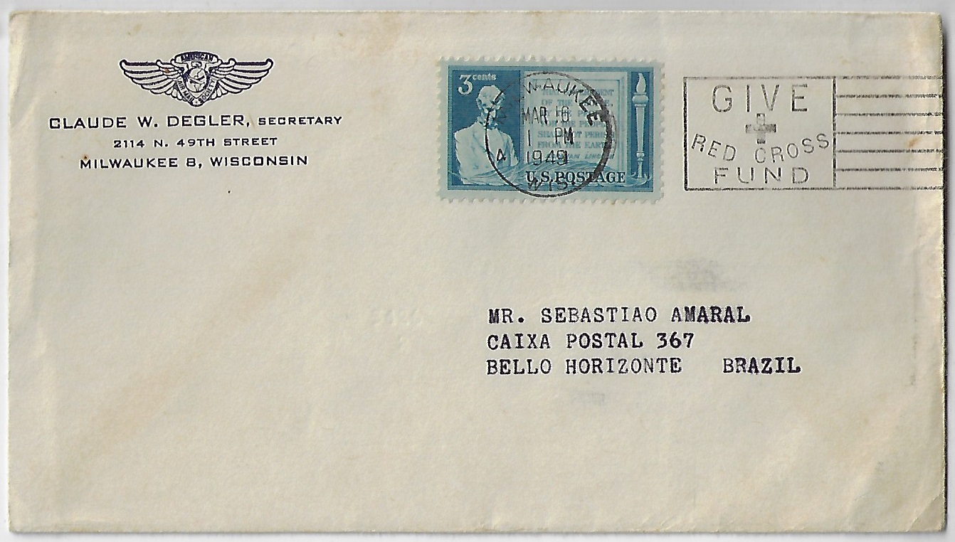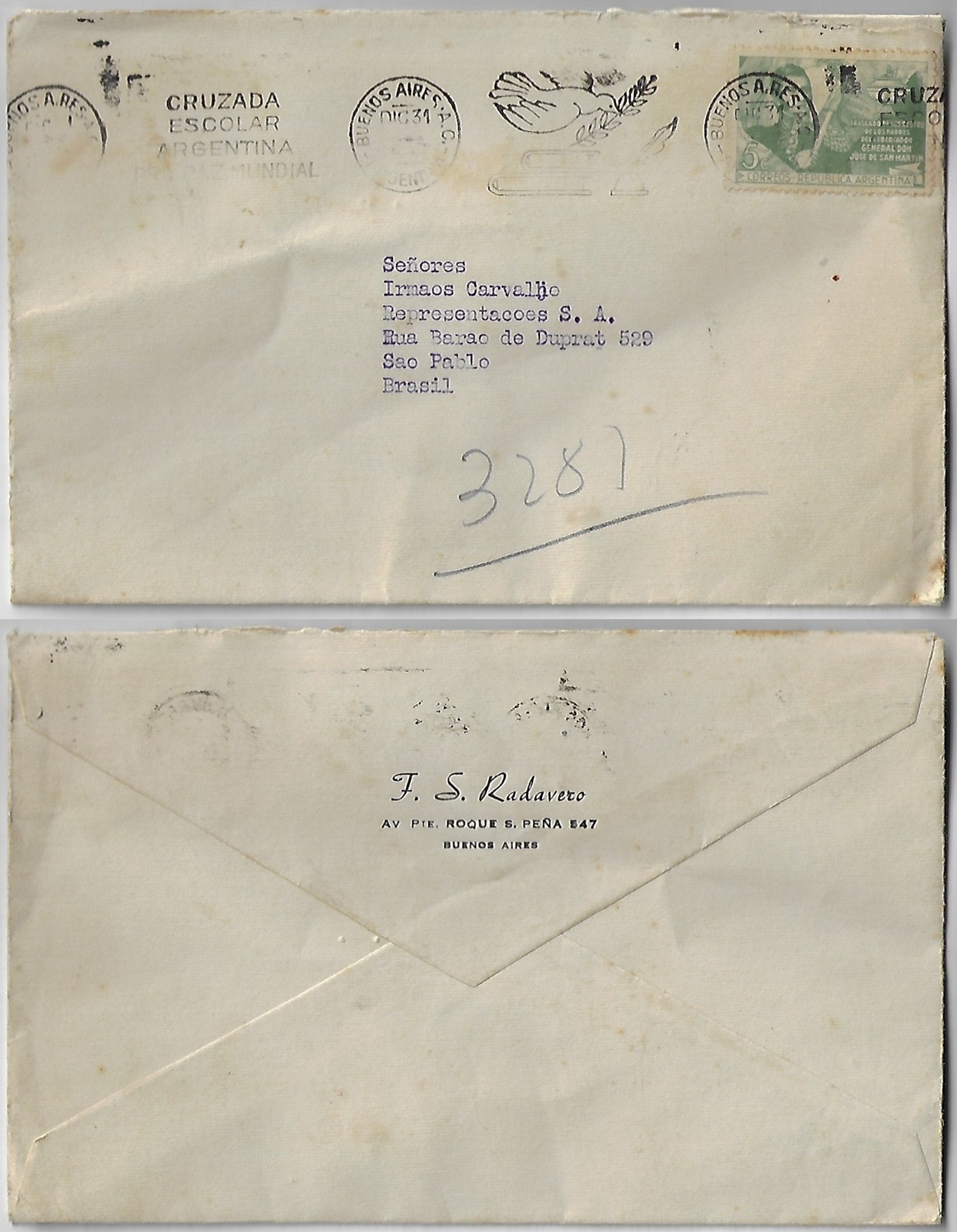 | 82258 | Argentina, 1947, envelope comercial de F.S.Radavero enviado de Buenos Aires (31/12) para São Paulo, reencaminhado para Caixa Postal, selo San Martin, carimbo com slogan "Cruzada escolar argentina pela paz mundial" | 10,00 | Foto |