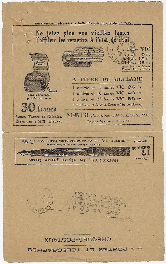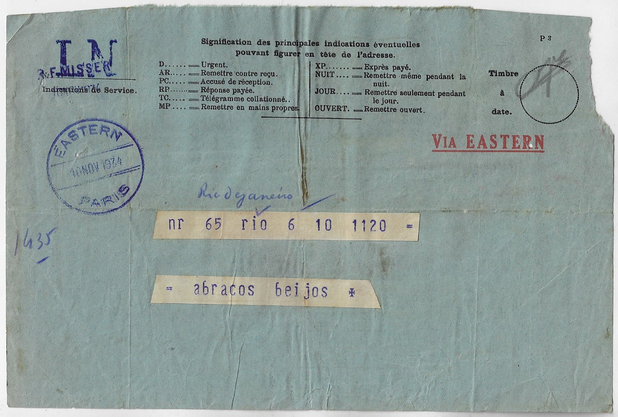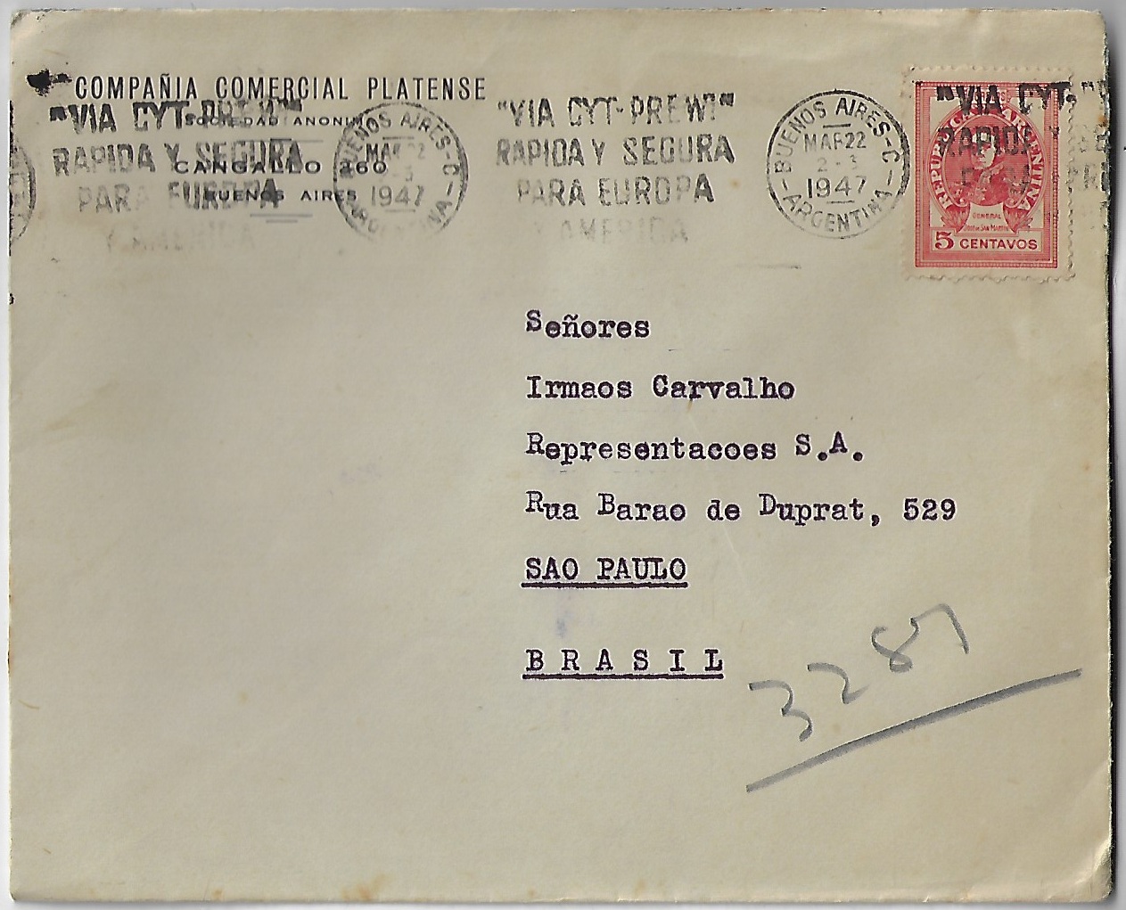 | 83734 | Argentina, 1947, envelope enviado de Buenos Aires (22/3) para São Paulo, reendereçado para Caixa Postal, selo San Martin, carimbo com slogan "Via CYT - PREWI rápida e segura para Europa e América", alusivo a serviço de comunicação radiotelegráfico | 10,00 | Foto |