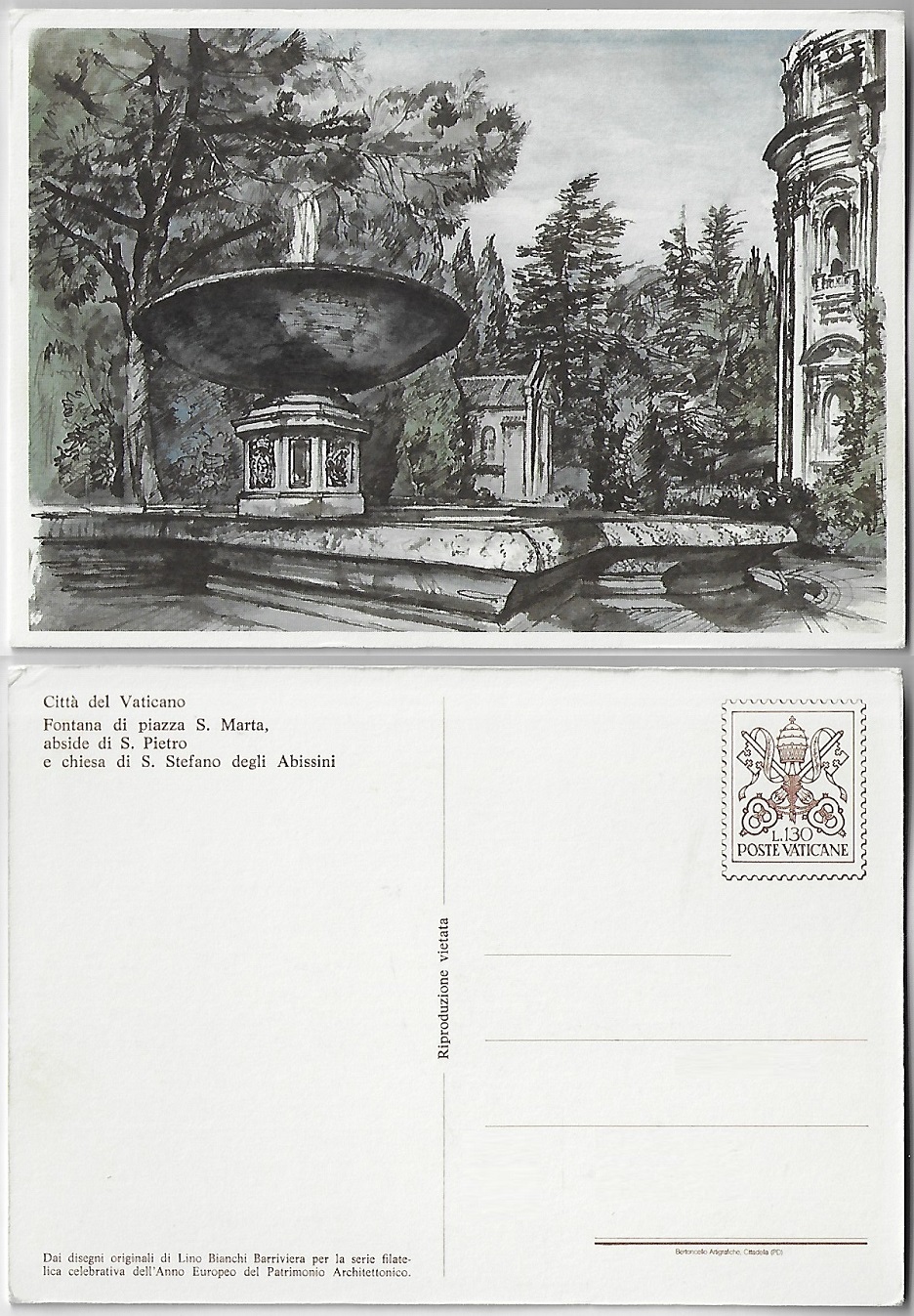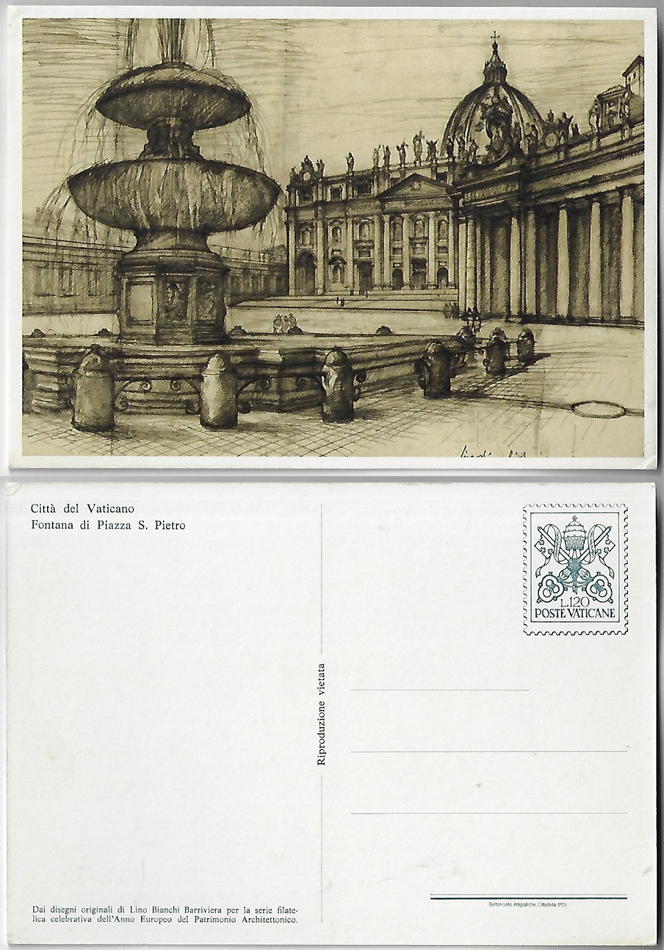 | 80956 | Vaticano, 1975, inteiro postal tipo bilhete selo Brasão 130 Liras com gravura Fonte da Praça Santa Marta, da série Ano Europeu do Patrimônio Arquitetônico, sem uso | 10,00 | Foto |