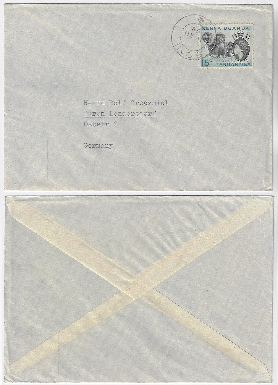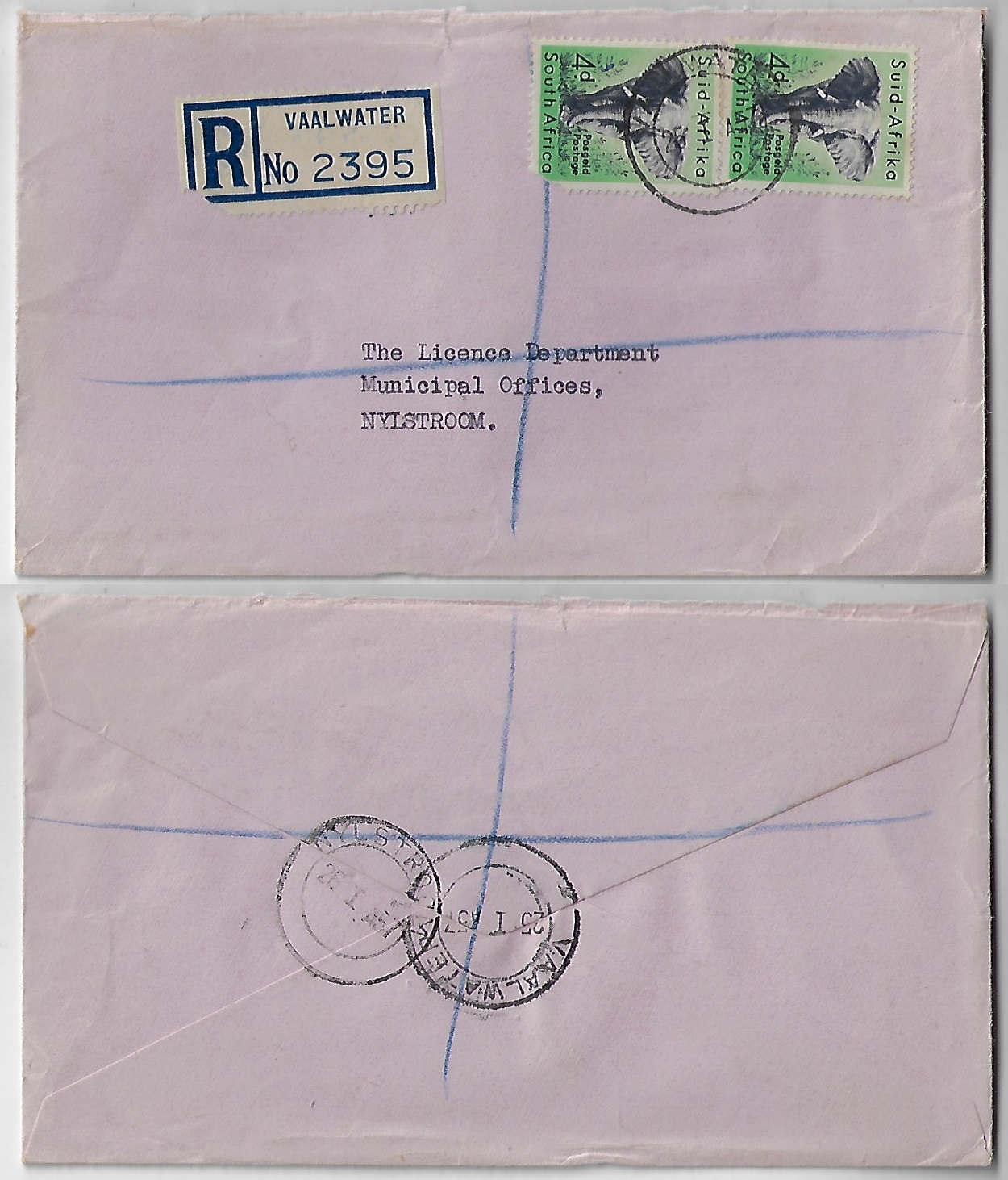 | 81263 | África do Sul, 1957, envelope com etiqueta de registro enviado de Vaalwater (25/1) para Nylstroom (26/1), porteado com 2 selos Elefante 4d | 10,00 | Foto |