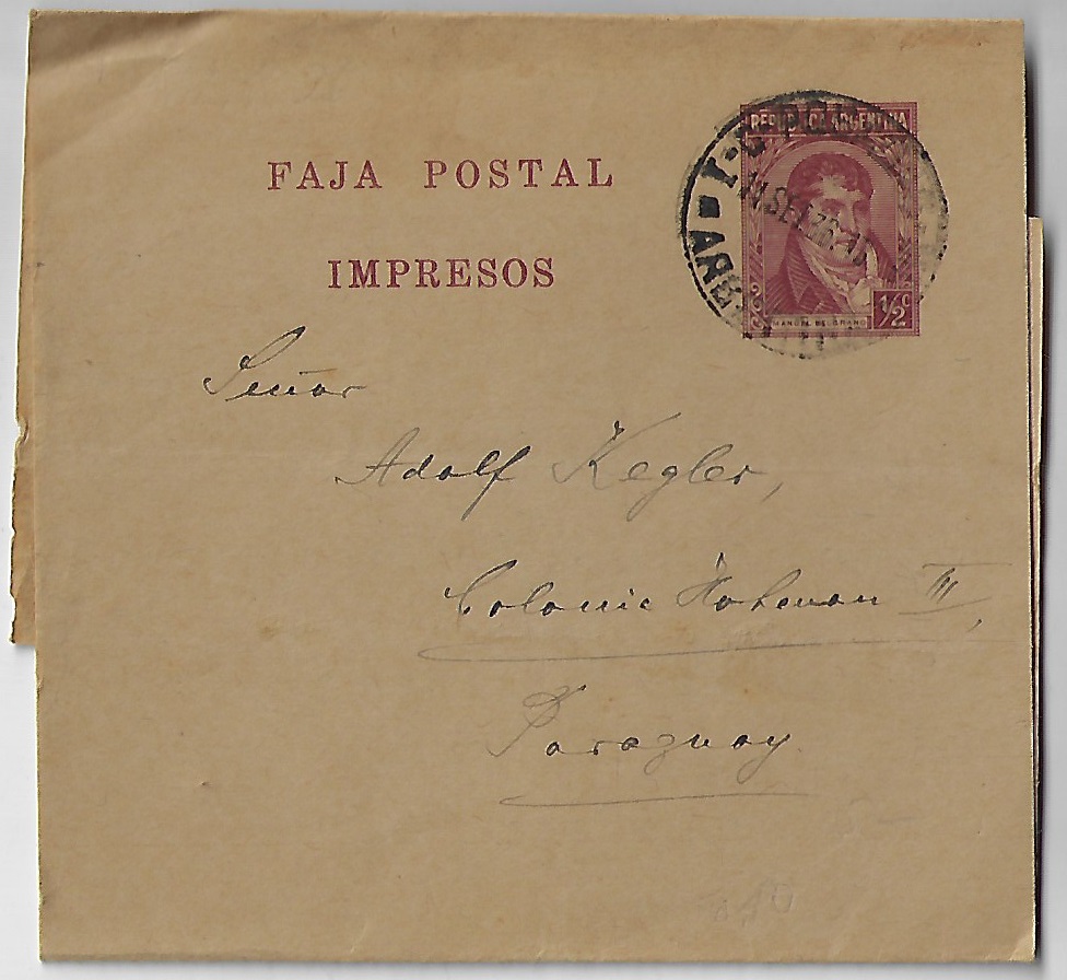 | 81558 | Argentina, 1936, inteiro postal tipo cinta para jornais com selo Manuel Belgrano ½ Centavo enviado ao Paraguai | 10,00 | Foto |
