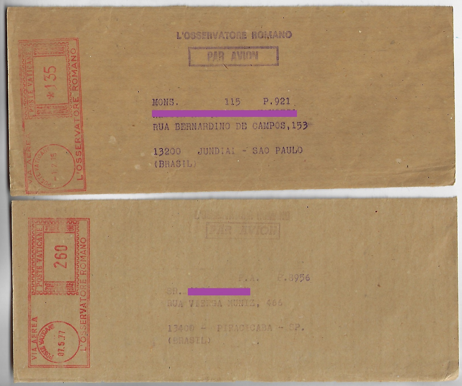 | 81877 | Vaticano, 1975/1977, 2 fragmentos de envelopes aéreos enviados ao Brasil porteados com franquias mecânicas Francotyp CD1 e CD2 com slogan "L'Osservatore Romano (O Observador Romano)" | 14,00 | Foto |