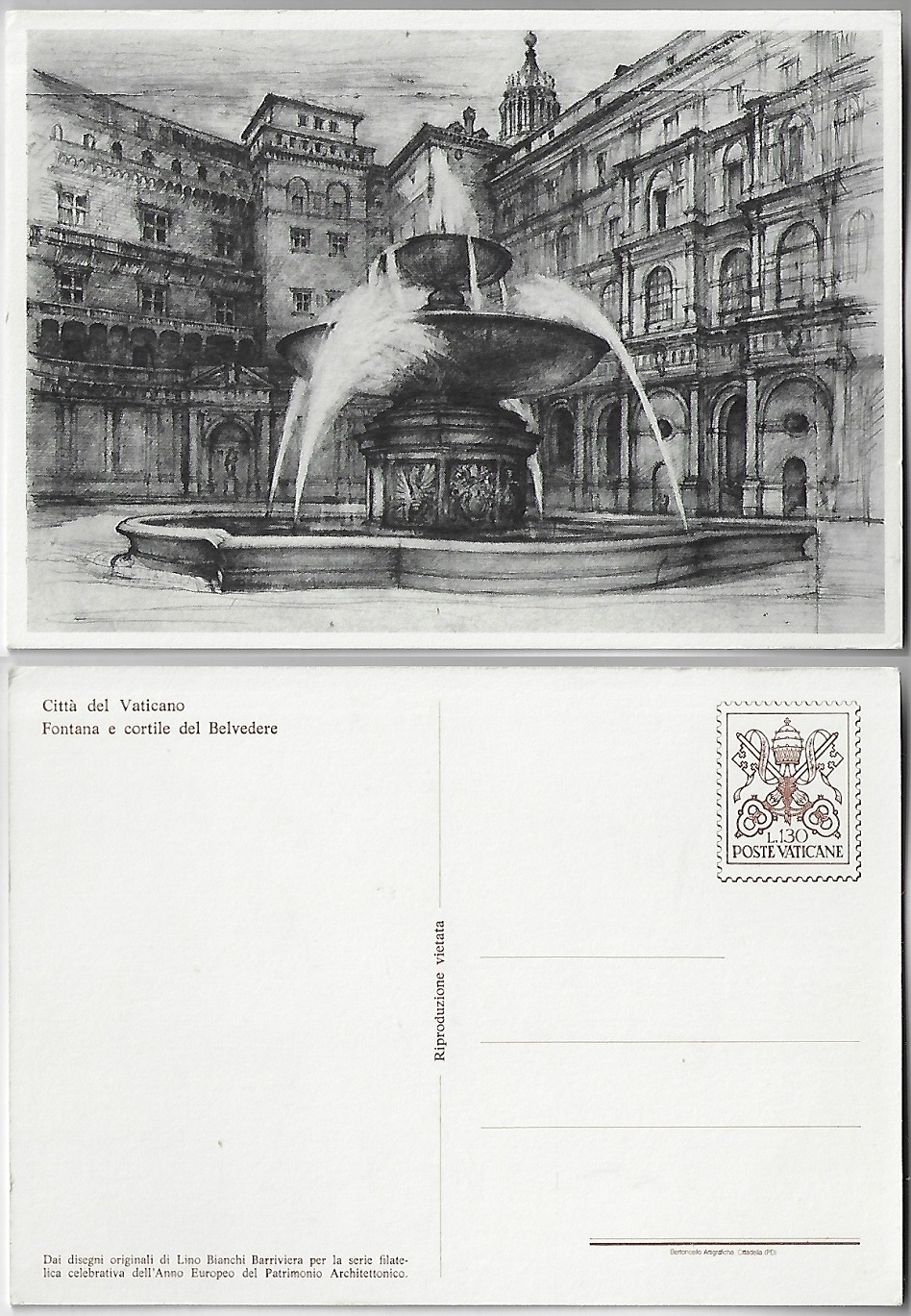 | 81932 | Vaticano, 1975, inteiro postal tipo bilhete selo Brasão 130 Liras com gravura Fonte e Pátio Belvedere, da série Ano Europeu do Patrimônio Arquitetônico, sem uso | 10,00 | Foto |