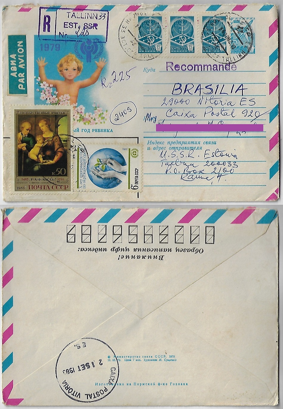 | 82195 | URSS, 1983, inteiro postal tipo envelope registrado enviado de Tallinn / Estônia (14/8) para Vitória (21/9), alusivo ao Ano Internacional da Criança, selos adicionais para porte internacional | 10,00 | Foto |