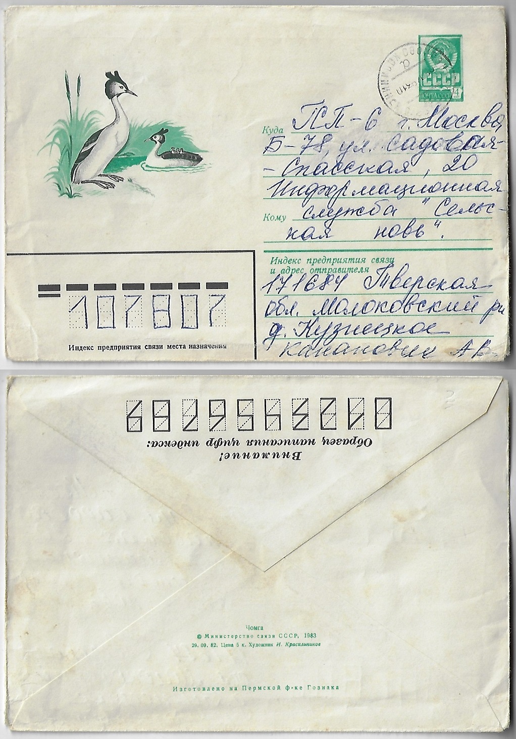| 82218 | URSS, 1993, inteiro postal tipo envelope enviado para Moscou, gravura de Aves Mergulhão-de-Crista (Podiceps cristatus) e seus filhotes | 10,00 | Foto |