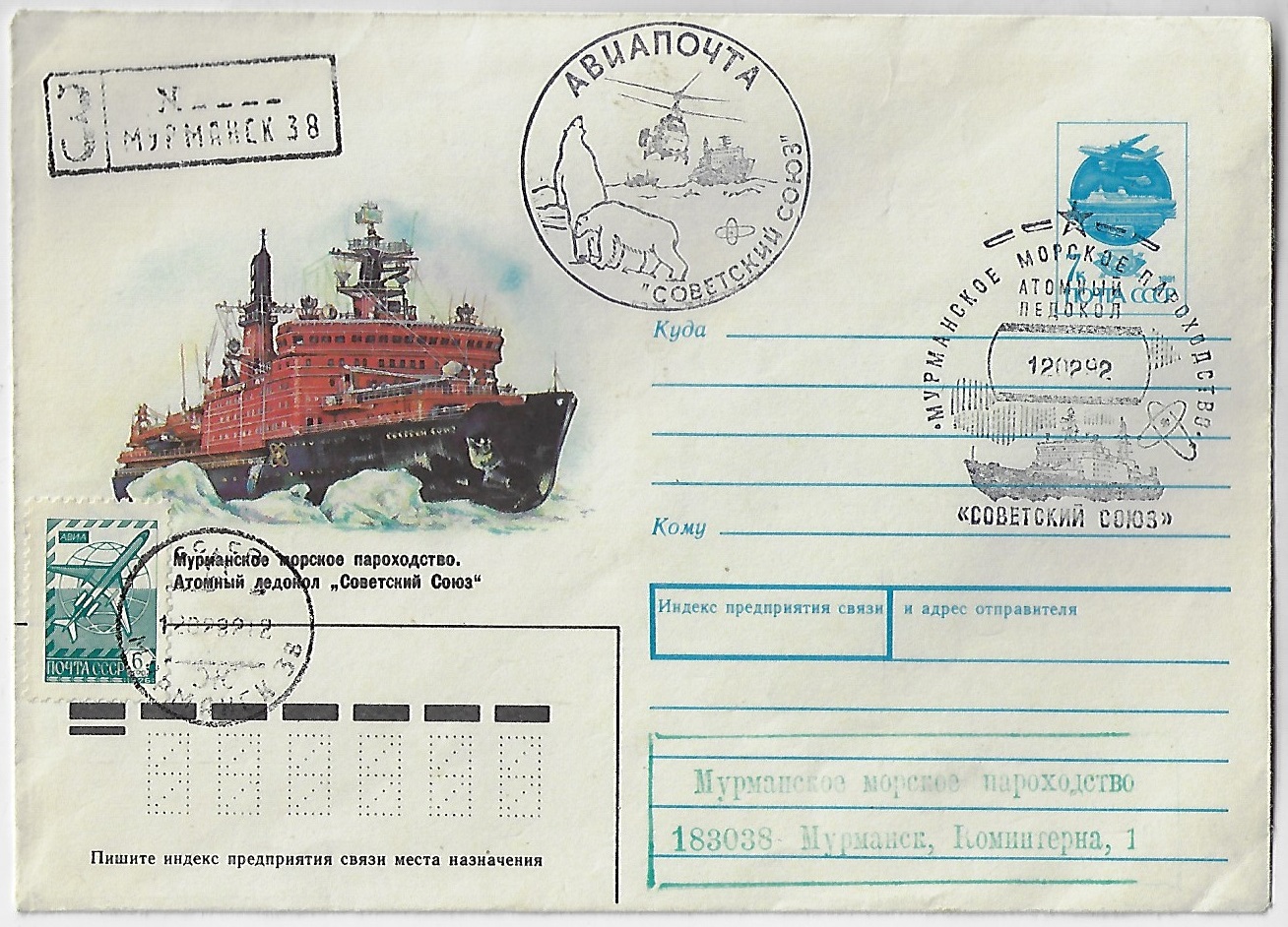 | 82299 | URSS, 1992, inteiro postal tipo envelope com carimbo, gravura e cachet da Companhia de Navegação Murmansk, Quebra-gelo nuclear "União Soviética", pólo norte, urso, helicóptero | 10,00 | Foto |