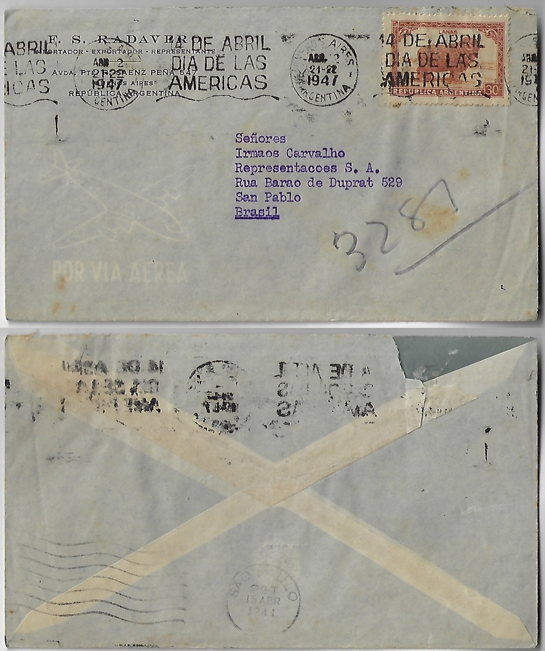 | 82310 | Argentina, 1947, envelope comercial de F. S. Radavero enviado de Buenos Aires (2/4) para São Paulo, reendereçado para Caixa Postal, porteado com selo Ovelha, carimbo mecânico rotativo com slogan "14 de Abril, Dia das Américas" ou Dia Pan-Americano | 10,00 | Foto |