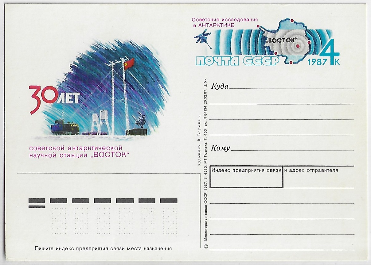 | 82350 | URSS, 1987, inteiro postal tipo bilhete alusivo a Estação de pesquisa antártica soviética VOSTOK, Polo Sul, Mapa, sem uso | 10,00 | Foto |