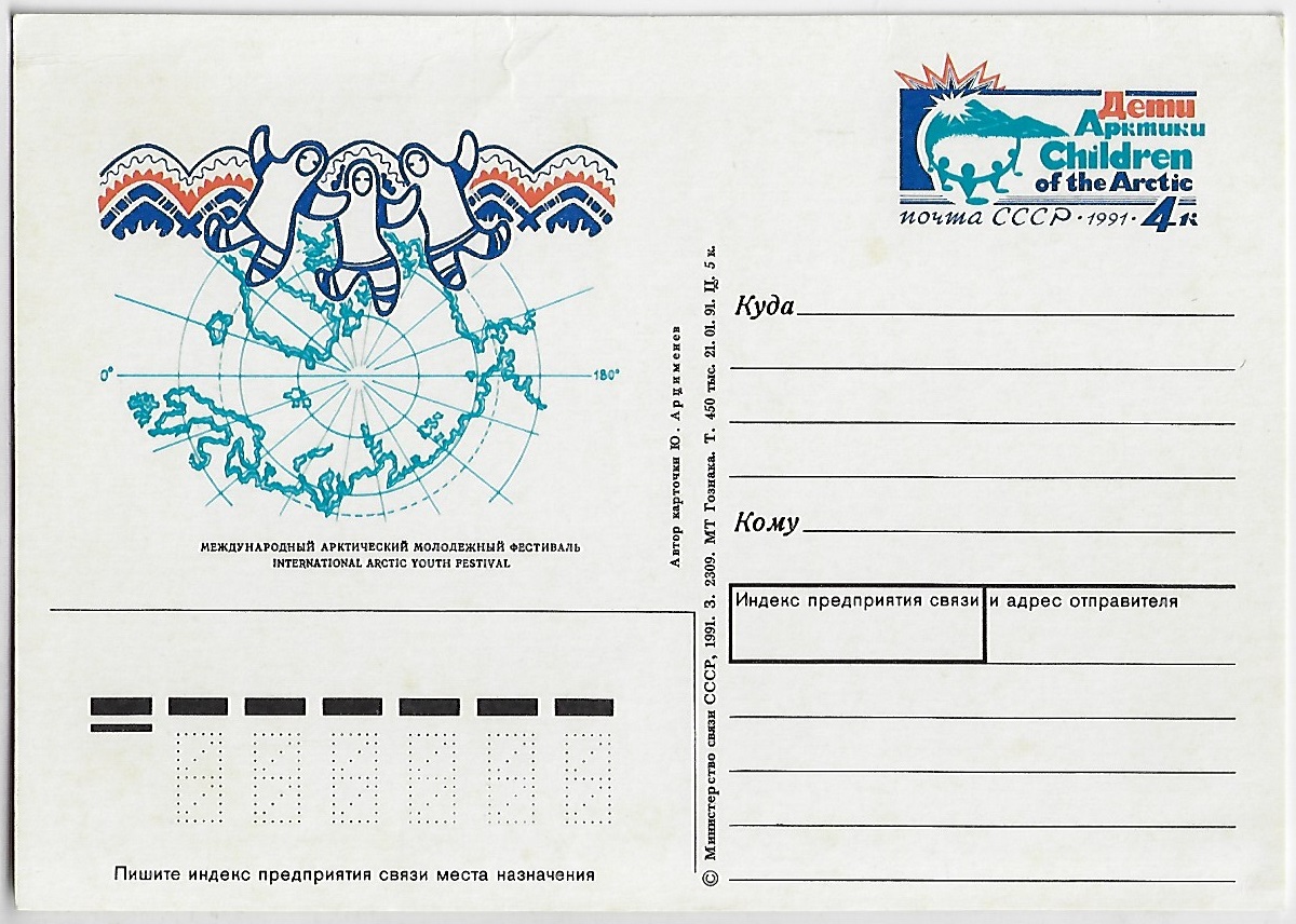 | 82354 | URSS, 1991, inteiro postal tipo bilhete alusivo a Crianças do Ártico, Festival Internacional da Juventude do Ártico, Polo Norte, Mapa, sem uso | 10,00 | Foto |