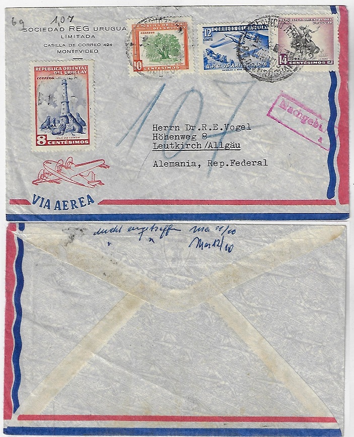| 82523 | Uruguai, 1957, envelope aéreo de Montevidéu (4/10) para Leutkirch / Alemanha, carimbo alemão (Nachgebühr = Taxado), porteado com 4 selos | 20,00 | Foto |