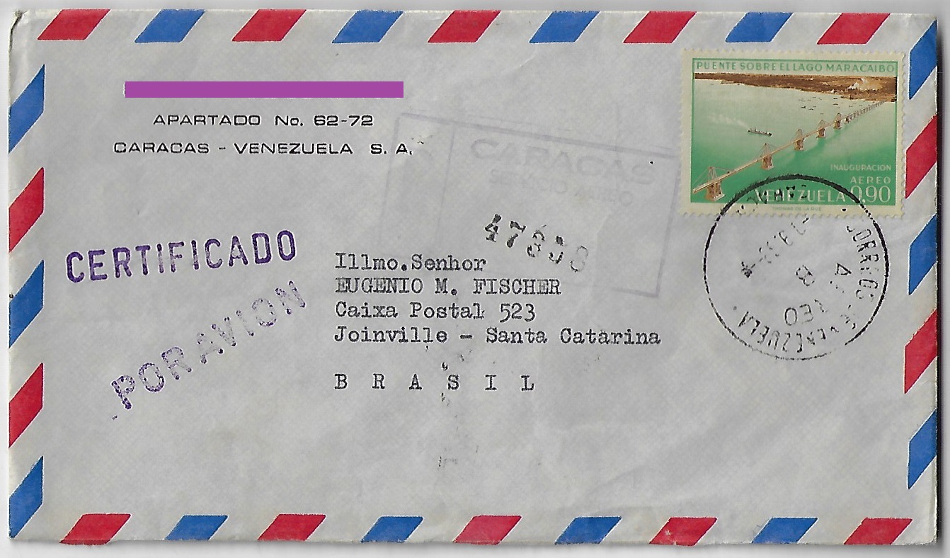 | 82959 | Venezuela, 1963, envelope aéreo registrado enviado de Caracas para Joinville, porteado com selo Inauguração da Ponte sobre o Lago Maracaibo | 10,00 | Foto |