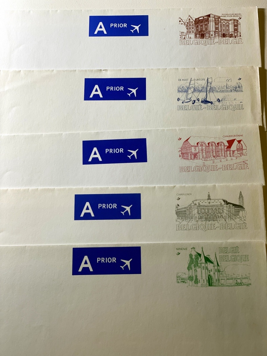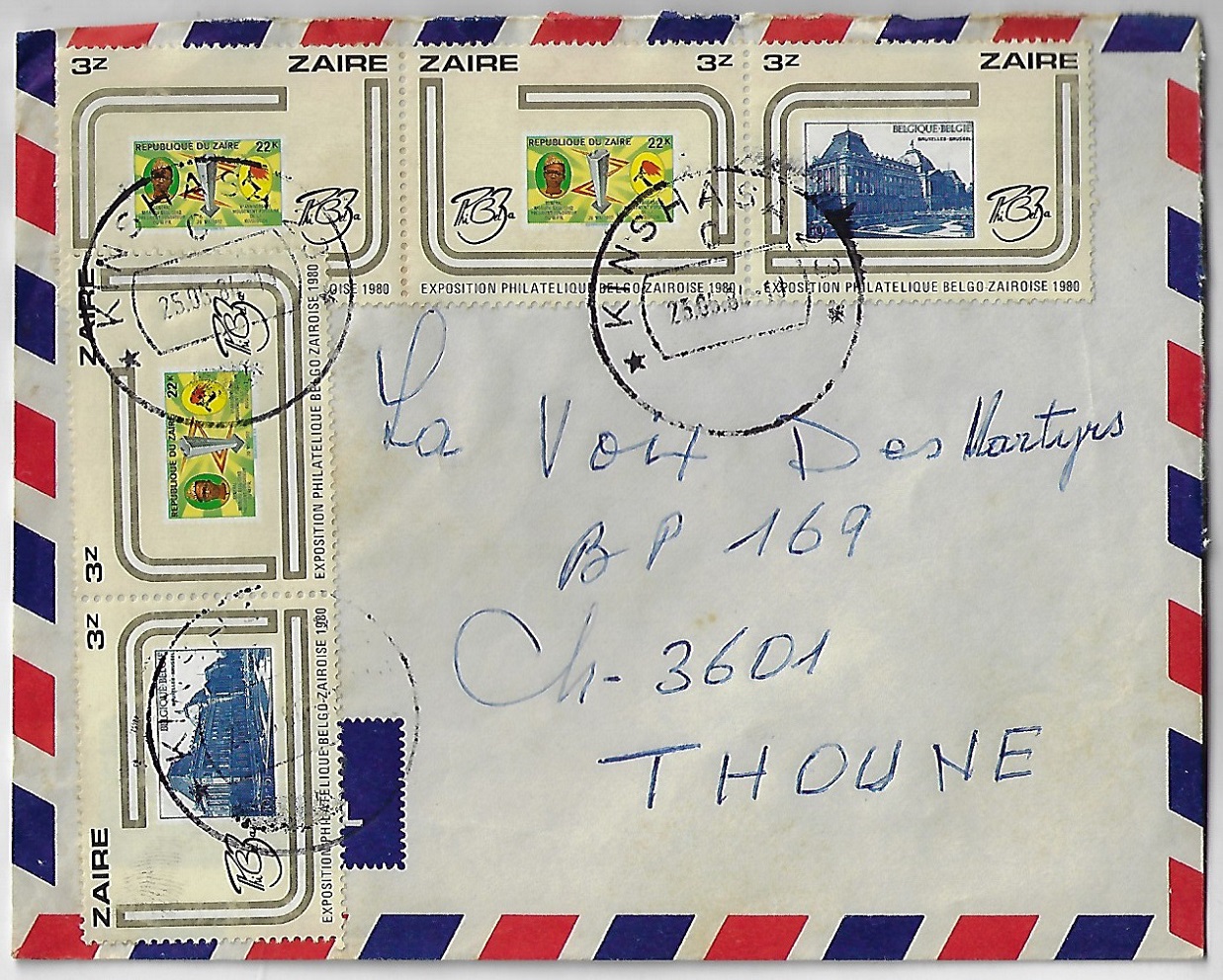 | 84339 | Zaire, 1984, envelope aéreo enviado de Kinshasa (25/5) para Thoune / Suíça, porteado com 5 selos Exposição filatélica Belgo-Zairiana, tema Selos sobre Selos | 10,00 | Foto |