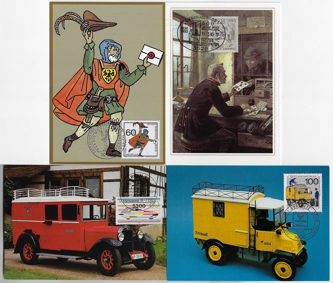 | 83267 | Alemanha e Berlin, 1983/1990, 4 máximos postais alusivos a Transporte Postal, Caminhão, Carteiro, Correio | 28,00 | Foto |