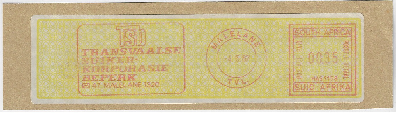 | 83272 | África do Sul, 1987, fragmento de envelope porteado com franquia mecânica com slogan alusivo a Transvaalse Suiker Korporasie Beperk (Transvaal Sugar Corporation), em Malelane, indústria do açúcar | 10,00 | Foto |