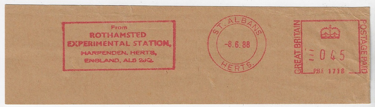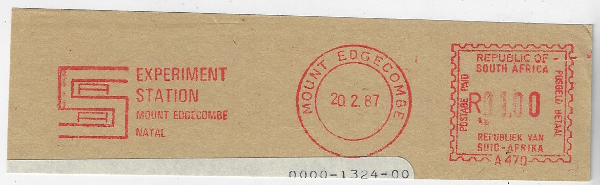 | 83282 | África do Sul, 1987, fragmento de envelope porteado com franquia mecânica com slogan alusivo a Experiment Station, em Mount Edgecombe / Natal, pesquisa agrícola do açúcar | 10,00 | Foto |
