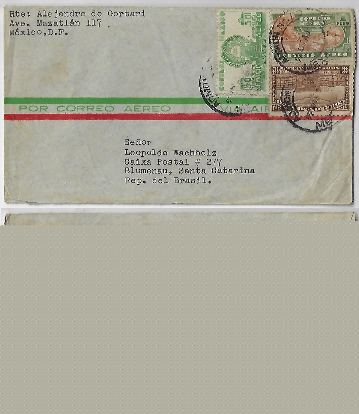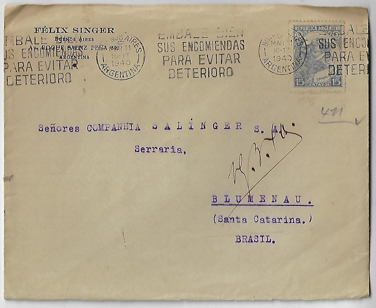 | 83573 | Argentina, 1940, envelope comercial de Félix Singer enviado de Buenos Aires (11/3) para Blumenau, passagem por Florianópolis (18/3), selo Gado 15 Centavos, carimbo com slogan "Embale bem suas encomendas para evitar deterioração" | 10,00 | Foto |
