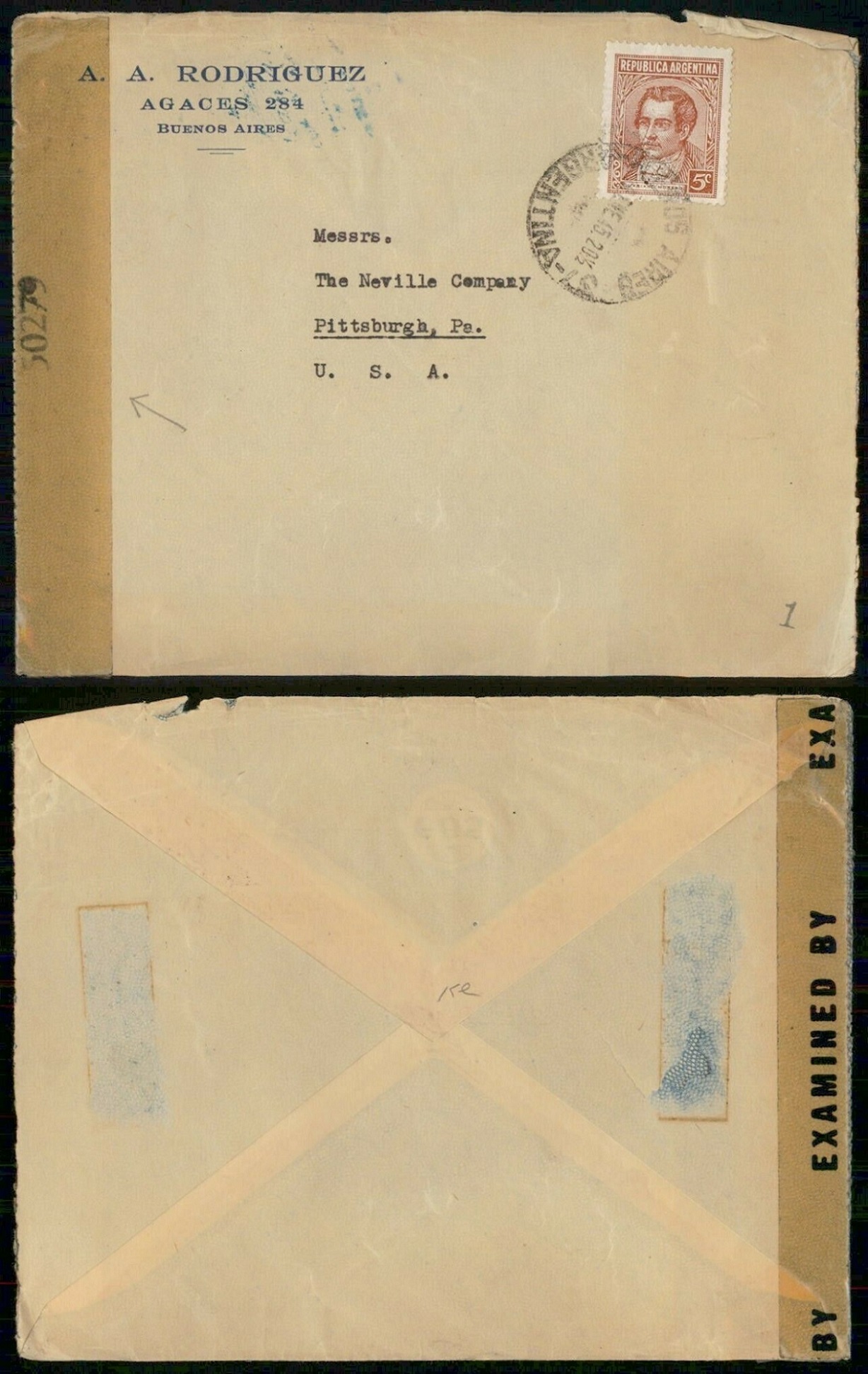 | 83683 | Argentina, 1945, envelope comercial de A.A.Rodriguez enviado de Buenos Aires para Pittsburgh / EUA, selo Mariano Moreno 5 Centavos, etiqueta de censura | 20,00 | Foto |