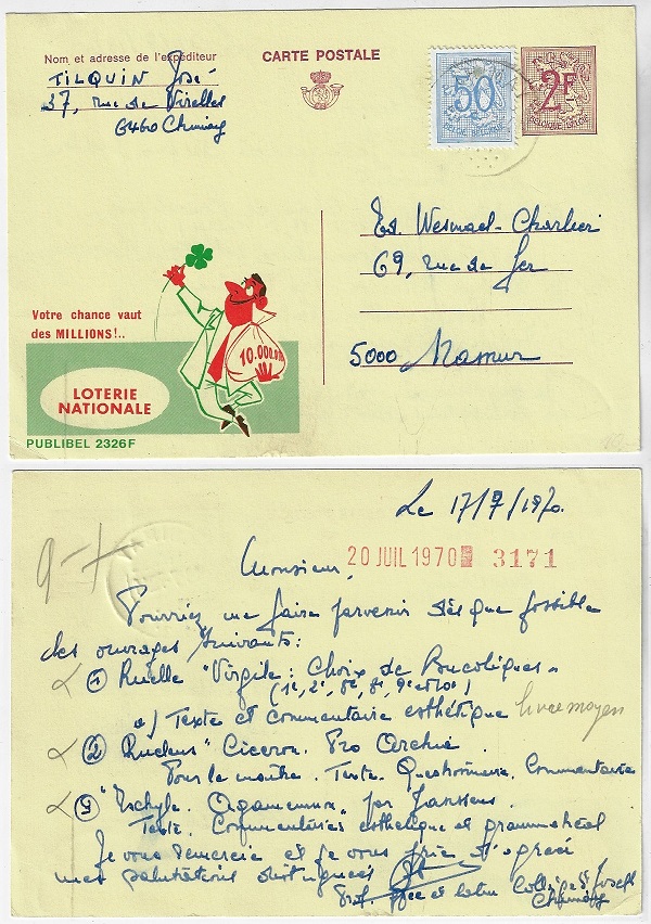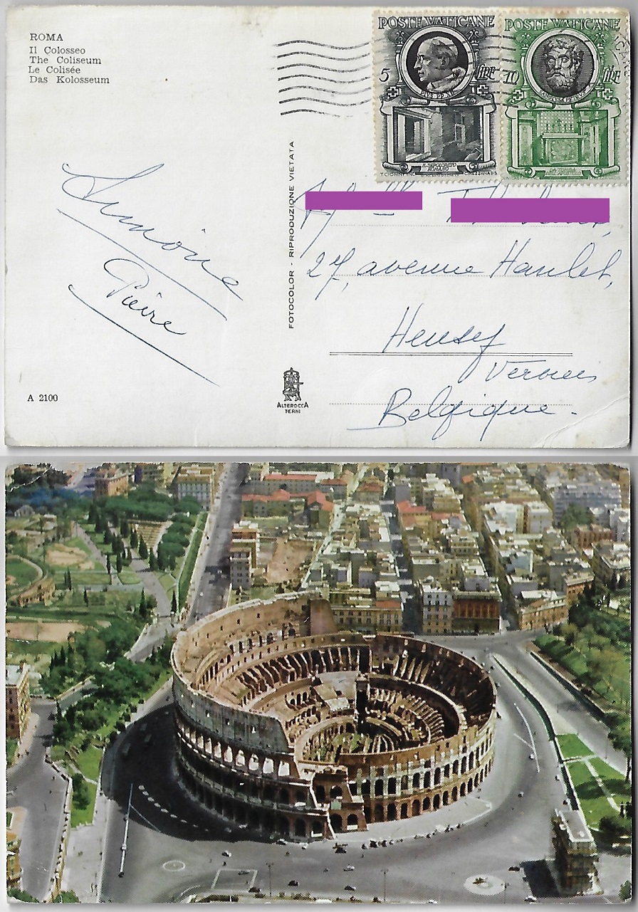 | 84637 | Vaticano, 1959, cartão postal com foto colorida do Coliseu, em Roma, enviado para Heusy / Bélgica, porteado com selos Papa Pio XII e Sepulcro Romano e São Pedro e seu Túmulo | 10,00 | Foto |