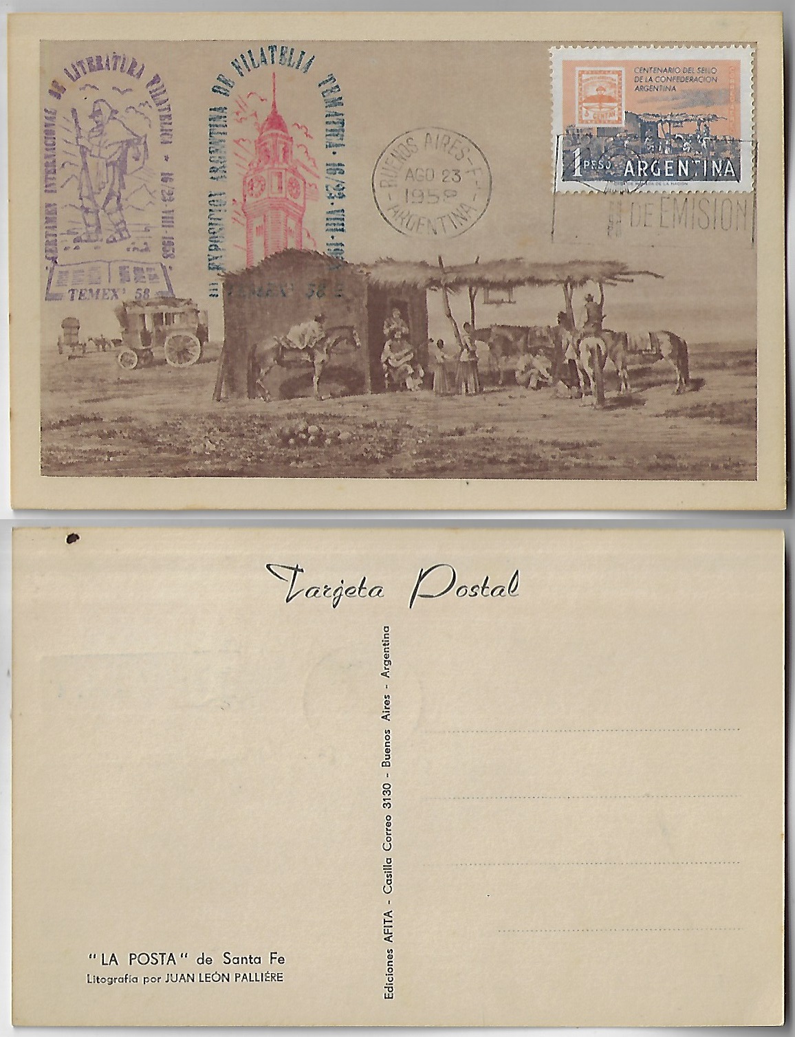 | 83893 | Argentina, 1958, máximo postal Centenário do Selo da Confederação Argentina e 2 carimbos comemorativos da TEMEX - Exposição Argentina de Filatelia Temática | 10,00 | Foto |