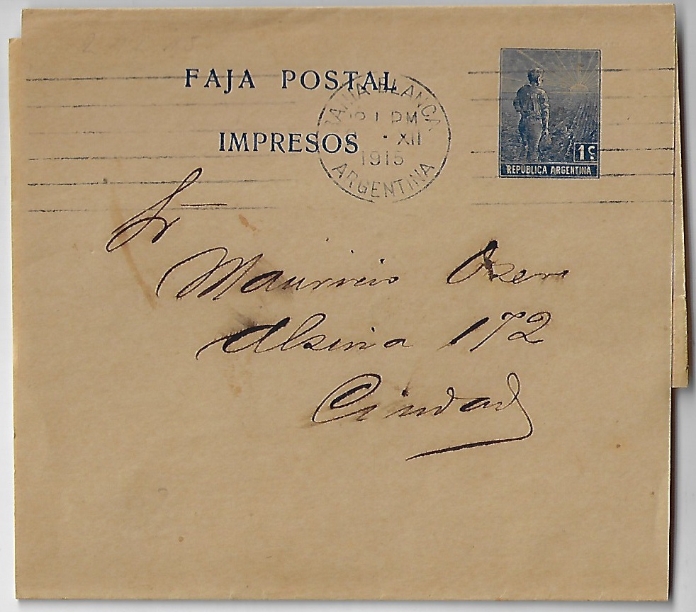 | 84286 | Argentina, 1915, inteiro postal tipo cinta para jornais com selo Trabalhador Agrícola 1 Centavo enviado de Bahia Blanca | 10,00 | Foto |
