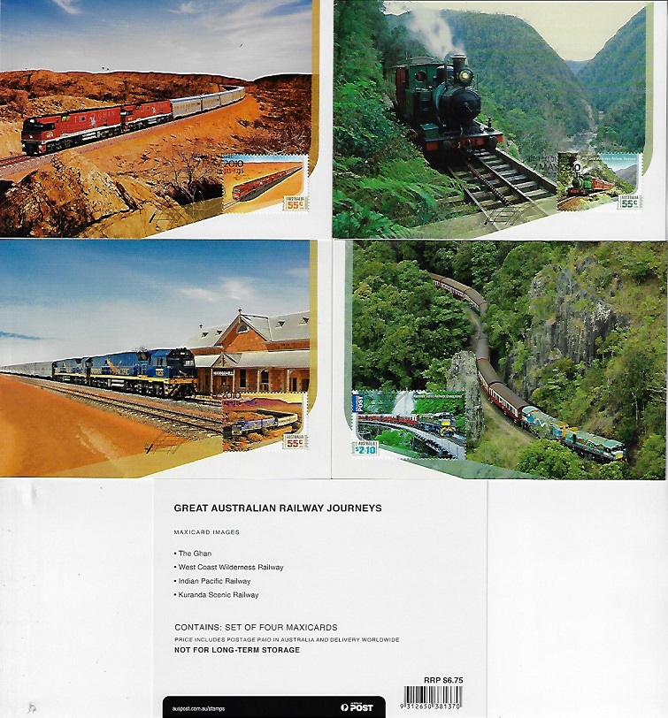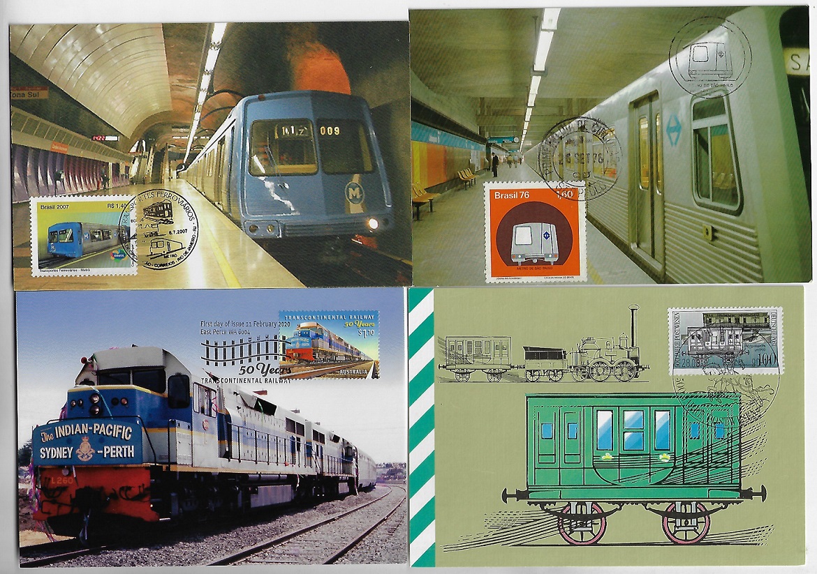 | 84426 | Alemanha, Austrália e Brasil, 1976/2020, 4 máximos postais alusivos a Transporte, Trem, Locomotiva, Vagão, Ferrovia, Metrô | 28,00 | Foto |
