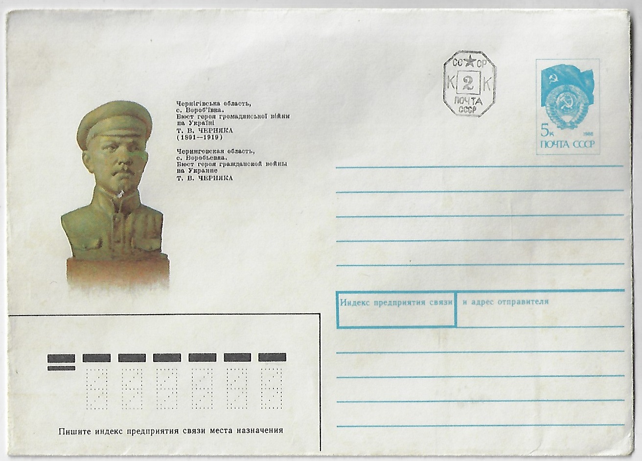 | 84666 | URSS, 1991, inteiro postal tipo envelope com Busto do Herói da Grande Guerra na Ucrânia, região de Chernihiv, sem uso | 10,00 | Foto |